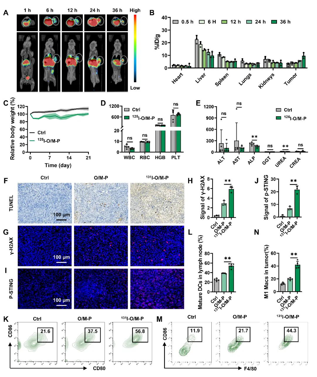 鉴于131I-O/M-P在细胞水平表现出明确的代谢-免疫调节能力与肿瘤杀伤效应,我们进一步开展体内研究。采用化学性质等同且辐射更安全的125I-O/M-P探究其体内行为的实验结果表明,其尾静脉注射后肿瘤部位高放射性摄取值,未见显著毒性反应,证实具有良好生物相容性与体内稳定性,并具备肿瘤靶向递送潜力。体内抗肿瘤及免疫激活验证结果显示,131I-O/M-P处理使肿瘤细胞凋亡显著增加、γ-H2AX信号升高,提示131I诱导的DNA双链断裂(DSBs)有效放大并转化为凋亡效应;同时肿瘤组织p-STING水平升高,淋巴结内CD80+ CD86+成熟树突状细胞(DC)比例上调,肿瘤组织中F4/80+ CD86+ M1型巨噬细胞极化增加(图3)。因此,131I-O/M-P在体内实现了放射损伤、先天免疫感知和适应性免疫激活的链式联动。