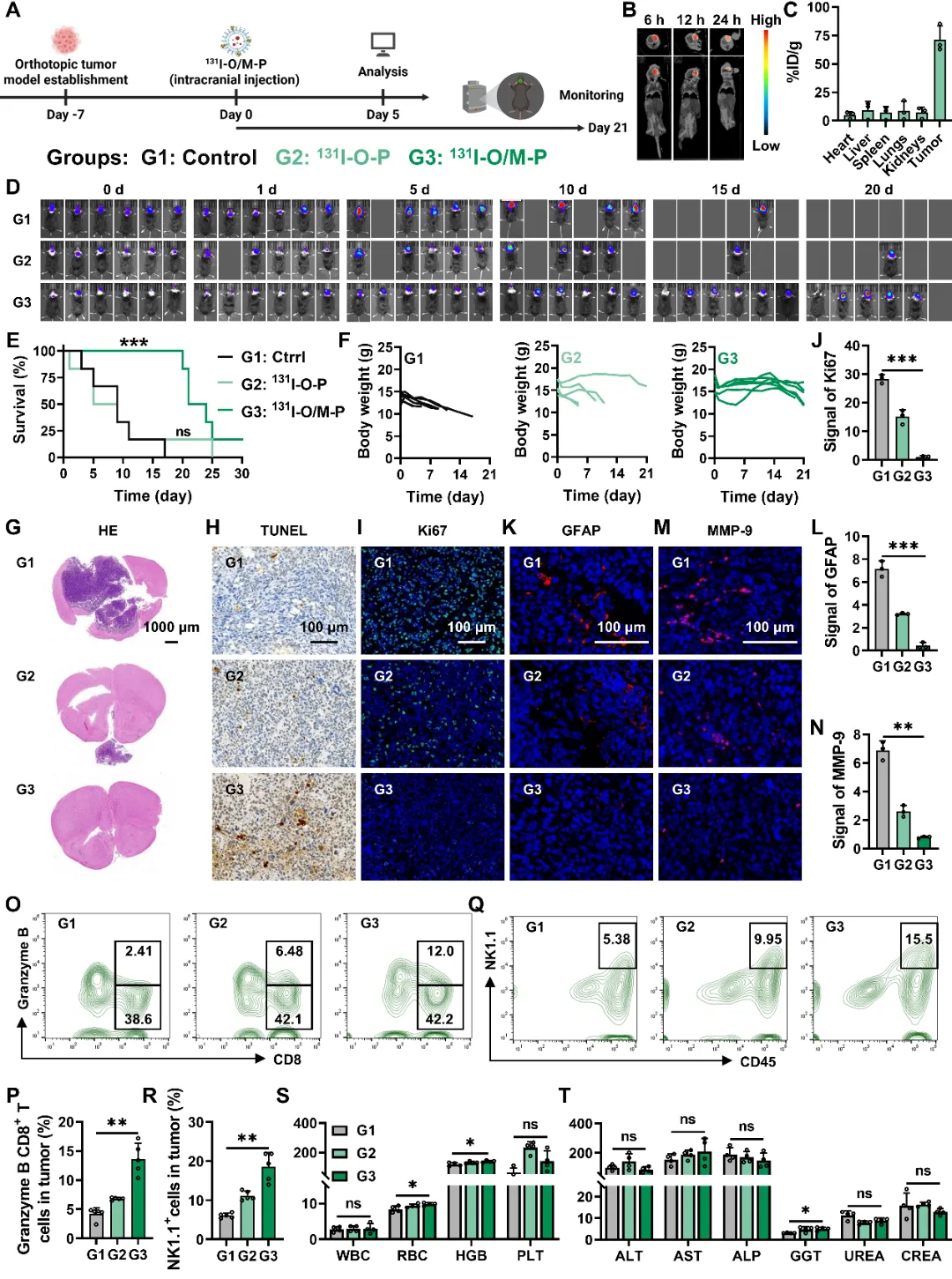 基于前述体内行为与免疫激活结果,我们进一步在GL261皮下肿瘤模型中评估131I-O/M-P的综合治疗能力。结果显示,131I-O/M-P具有最显著的肿瘤抑制作用,肿瘤生长几乎被完全阻断,肿瘤组织结构破坏,Ki67与PCNA免疫荧光显著下调,提示肿瘤细胞增殖被有效限制。进一步的免疫分析显示,131I-O/M-P治疗后肿瘤组织内CD3+CD8+GranzymeB+细胞毒性T细胞(CTL)比例显著上升,CD3+CD8+PD-1+T细胞比例下降,表明在获得性免疫被激活的同时,T细胞功能抑制状态亦得到改善,有利于持续的效应阶段。此外,肿瘤组织内CD45+NK1.1+自然杀伤(NK)细胞浸润比例增加,提示先天杀伤通路被并行增强,可与CTL形成互补杀伤网络(图4)。因此,131I-O/M-P在皮下胶质瘤模型中实现了放射-代谢-免疫治疗。一方面,131I的持续辐射与MTX介导的代谢抑制共同放大DNA损伤并限制修复,从而抑制肿瘤增殖;另一方面,ICD标志上调、STING轴激活、DC成熟与 M1极化推动了CTL与NK的有效募集与功能维持,进一步重塑免疫微环境并放大抗肿瘤效应,为后续在原位脑瘤模型中的验证与机制精细化研究提供了坚实依据。