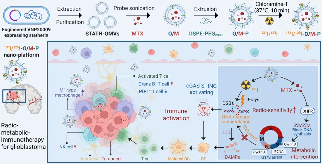 脑胶质瘤因位置深、血脑屏障坚固且免疫环境高度抑制,导致治疗效果差、复发快。现有方案中,单纯放疗易因肿瘤细胞损伤修复而失效;甲氨蝶呤(MTX)虽能干扰DNA合成,却难以精准入脑且易损伤正常组织;免疫疗法则因脑内缺乏有效免疫激活信号而响应微弱。细菌外膜囊泡(OMVs)作为源自微生物的纳米级载体,天然具备免疫激发潜能,且可安全递送药物进入复杂组织,在脑部疾病治疗中具有潜在适用性。然而,天然囊泡存在脑瘤靶向效率低、无法同步负载放射性物质与化疗药的缺陷,导致治疗碎片化、效应不同步。因此,如何让放射杀伤、代谢抑制与免疫唤醒在同一时空维度精准接力,成为突破脑胶质瘤治疗瓶颈的关键矛盾。