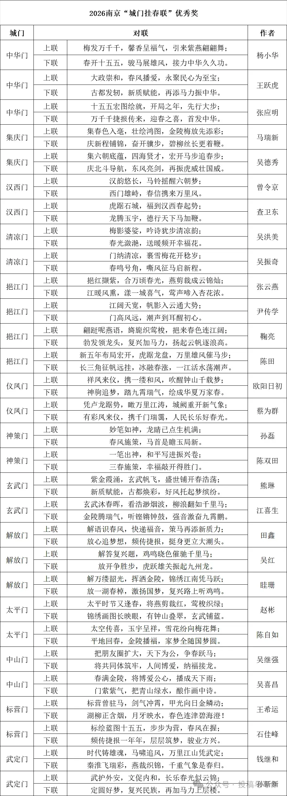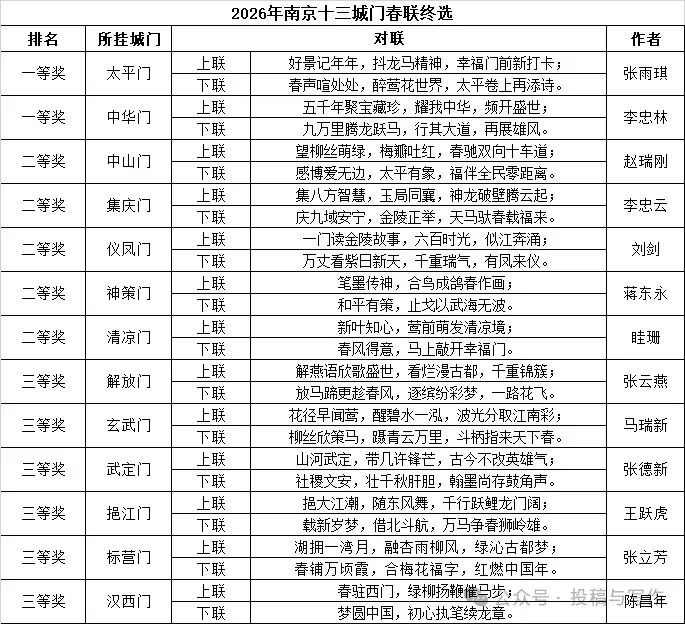 日前,主承办方邀请了7位专家学者、楹联大家共同评联。经公示,2026年度南京十三城门春联诞生了。同时,优秀奖、新苗奖及新增设的十佳人气奖也一同揭晓。