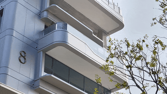 这是徐州首个双曲面立面楼盘,外立面转角铝板、转角阳台玻璃全部做了弧形打磨。