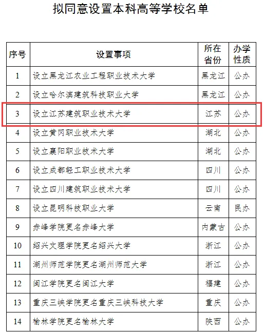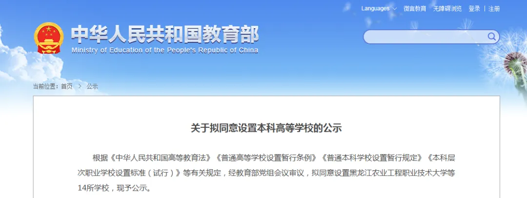 根据《中华人民共和国高等教育法》《普通高等学校设置暂行条例》《普通本科学校设置暂行规定》《本科层次职业学校设置标准(试行)》等有关规定,经教育部党组会议审议,拟同意设置黑龙江农业工程职业技术大学等14所学校,现予公示。
