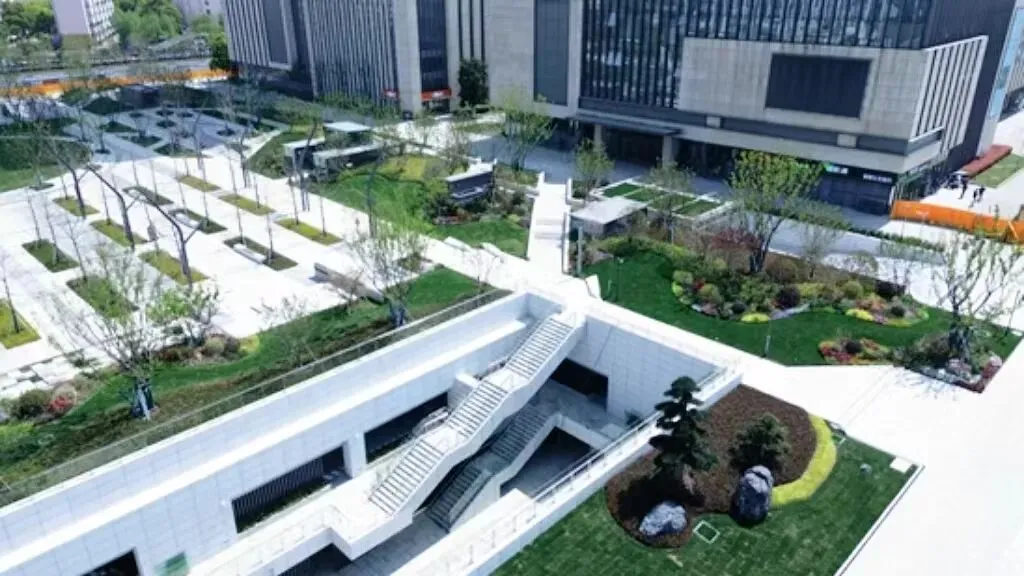 景观以“山水之间,新城绿谷”为理念,将出地面建筑纳入景观中,使得原本分割立面的建筑与景观融为一体,整体打造为绿谷景观,让场地的消极面转变为场地独特的记忆点。△改造后广场鸟瞰:融入景观中的建筑