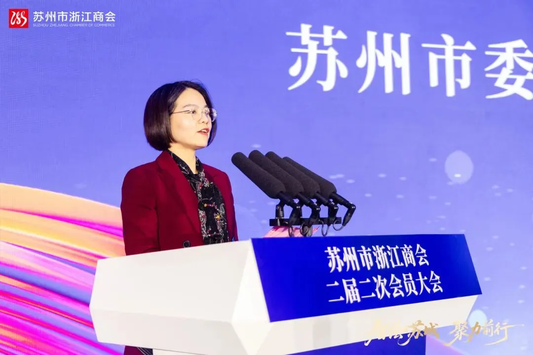 苏州市委统战部副部长、市工商联党组书记王蓓蕾充分肯定了换届后以金双龙会长为主的新一届领导班子团结带领会员企业,在组织建设、服务优化、党建会建融合等方面取得的突破性进展。王蓓蕾指出,党的二十届四中全会为“十五五”发展擘画蓝图,为民营经济创造了前所未有的历史机遇。她勉励苏州市浙江商会持续深化政治引领、强化自身建设、推动经济创新、完善服务体系,努力打造成为具有政治敏锐性、合规示范性、生态协同性的感知型标杆商会。