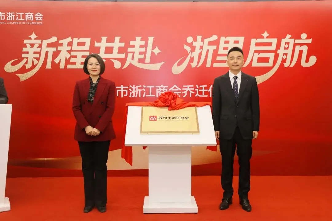 典礼现场,苏州市工商联党组书记王蓓蕾与商会会长金双龙共同为商会新址揭牌。