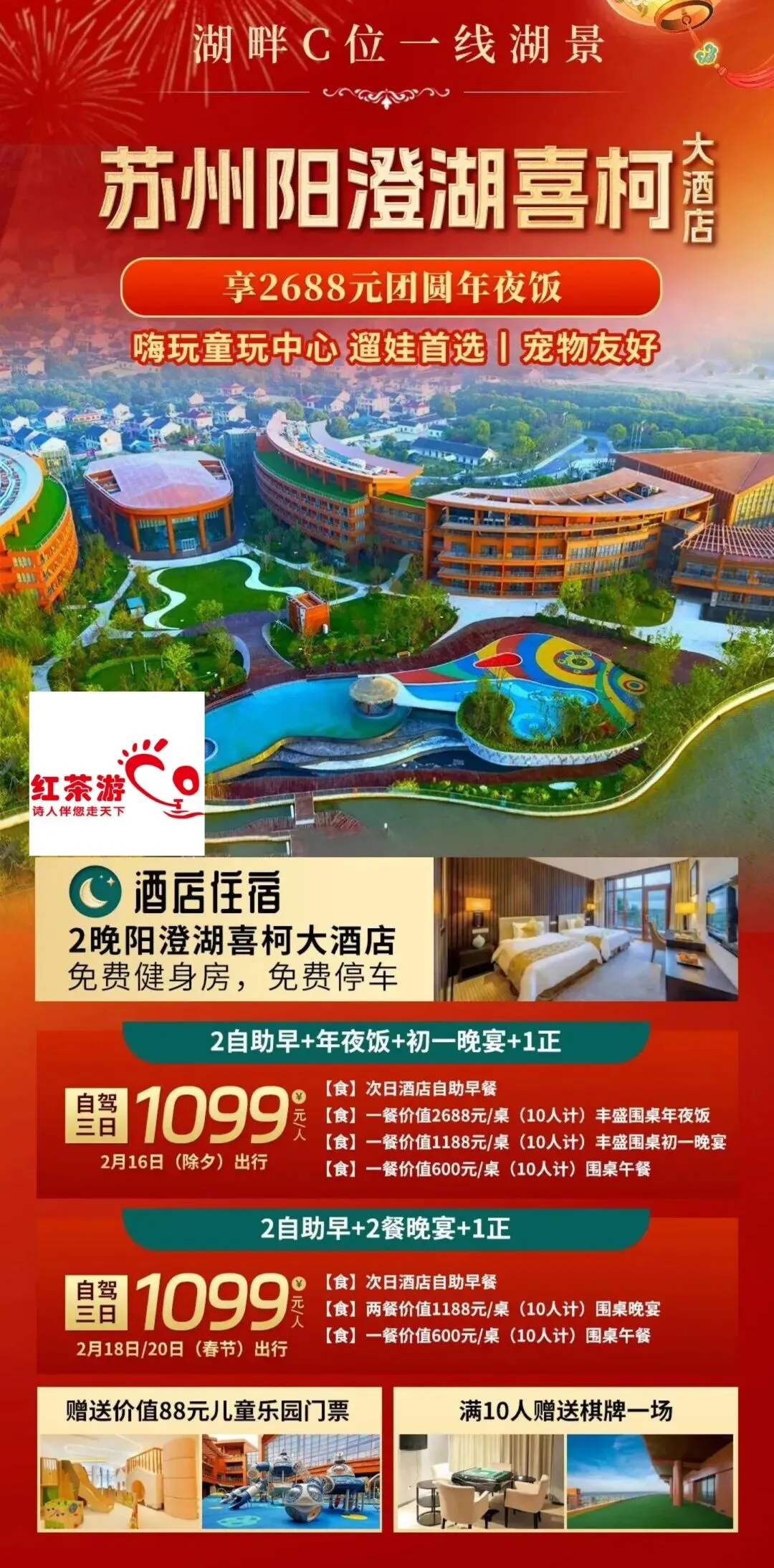 春节班期用餐默认包含第一天晚餐+第二天午餐+第二天晚餐;春节期间菜单由酒店依次随机安排,不接受指定菜单