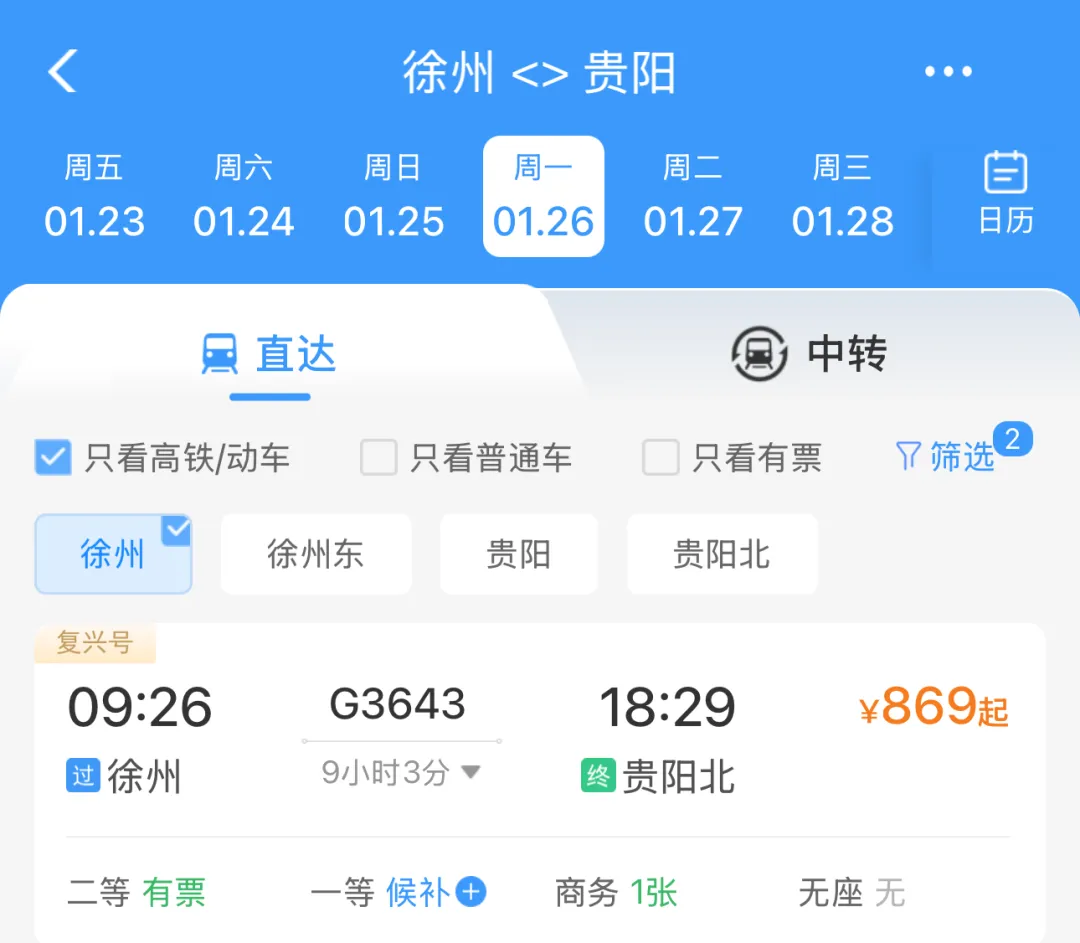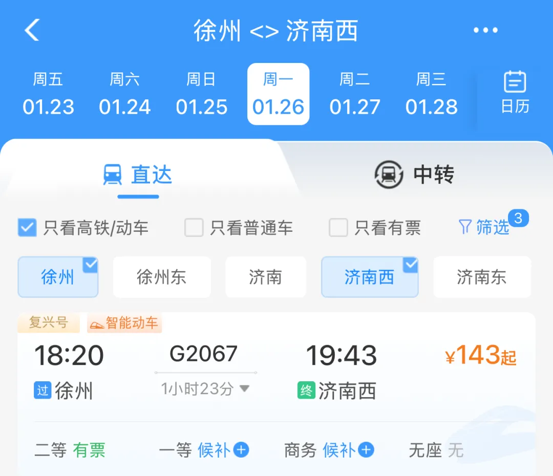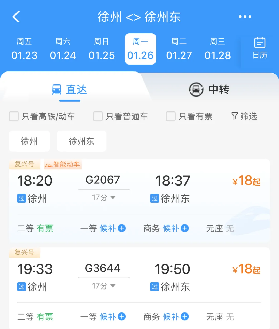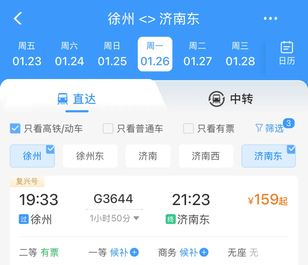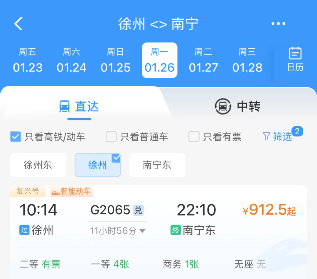 记者登录12306系统查询发现,徐州站至徐州东站间已同步开行高铁,最快17分钟可达,二等座票价18元,为旅客中转提供了“无缝衔接”的新选择。
