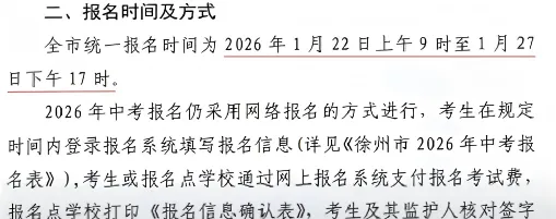 各位初三家长!2026年徐州中考报名时间已定,全市统一报名时间为1月22日上午9时至1月27日下午17时,报名仍采用网络报名的方式进行。