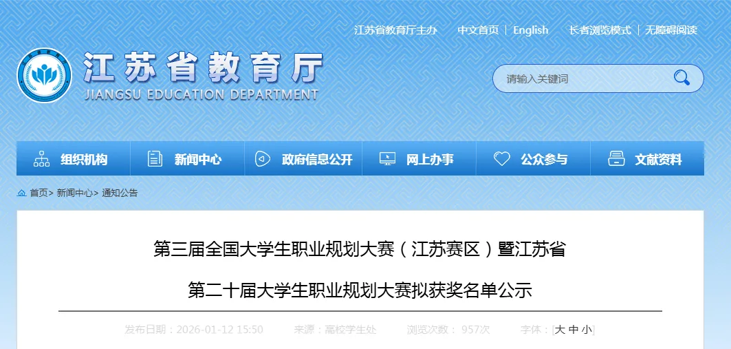 第三届全国大学生职业规划大赛(江苏赛区)暨江苏省第二十届大学生职业规划大赛决赛已顺利完成。按照工作程序,现将拟获奖名单(见附件)予以公示。公示时间为2026年1月13日—1月19日。