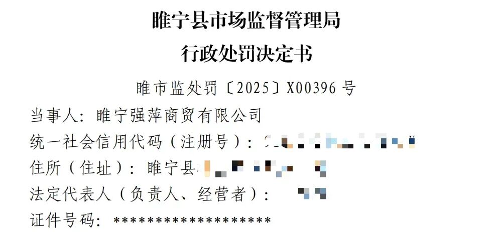 被江苏省睢宁县市场监管局处罚