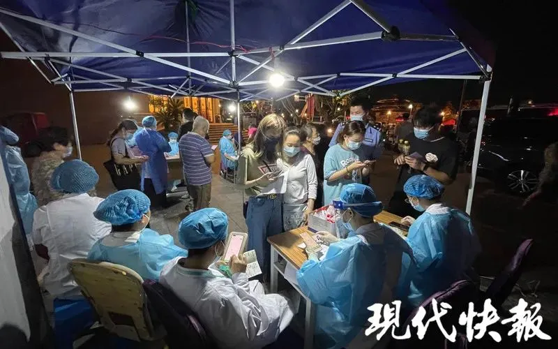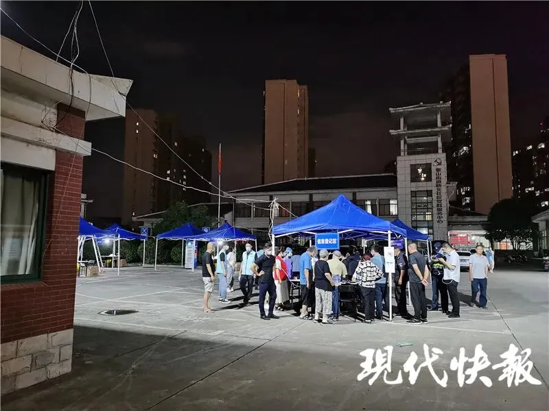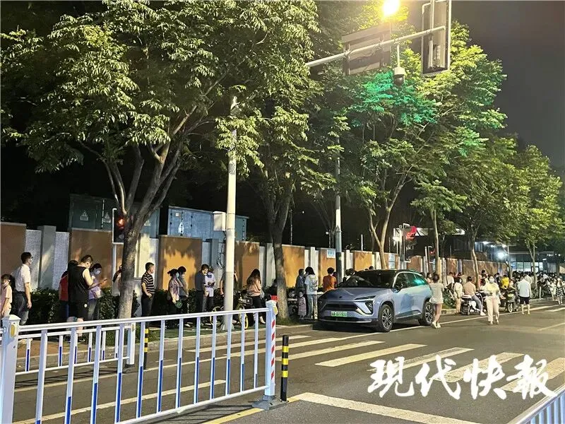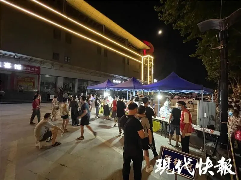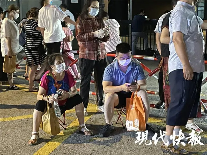 临近7月22日零点,南京五台山体育中心,市民排队检测核酸秩序井然。