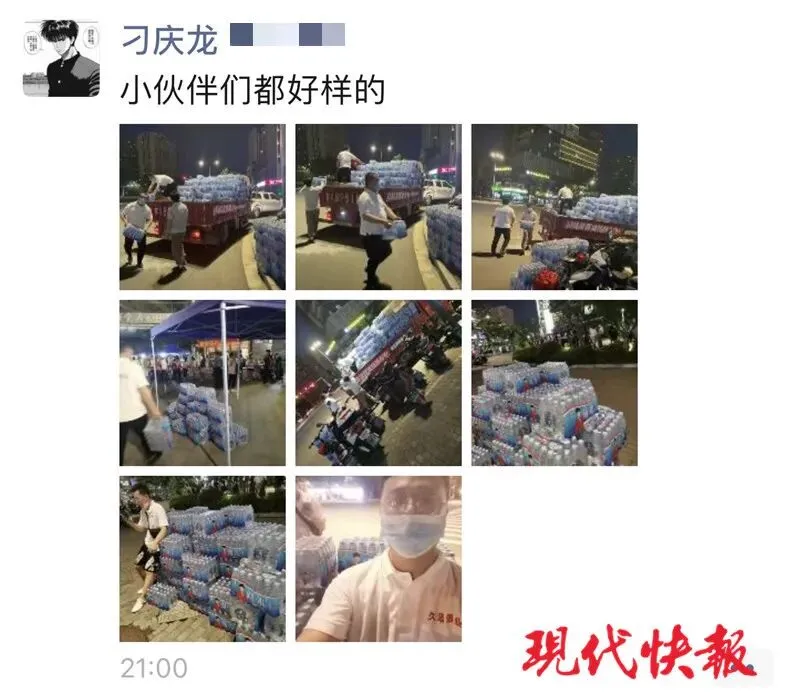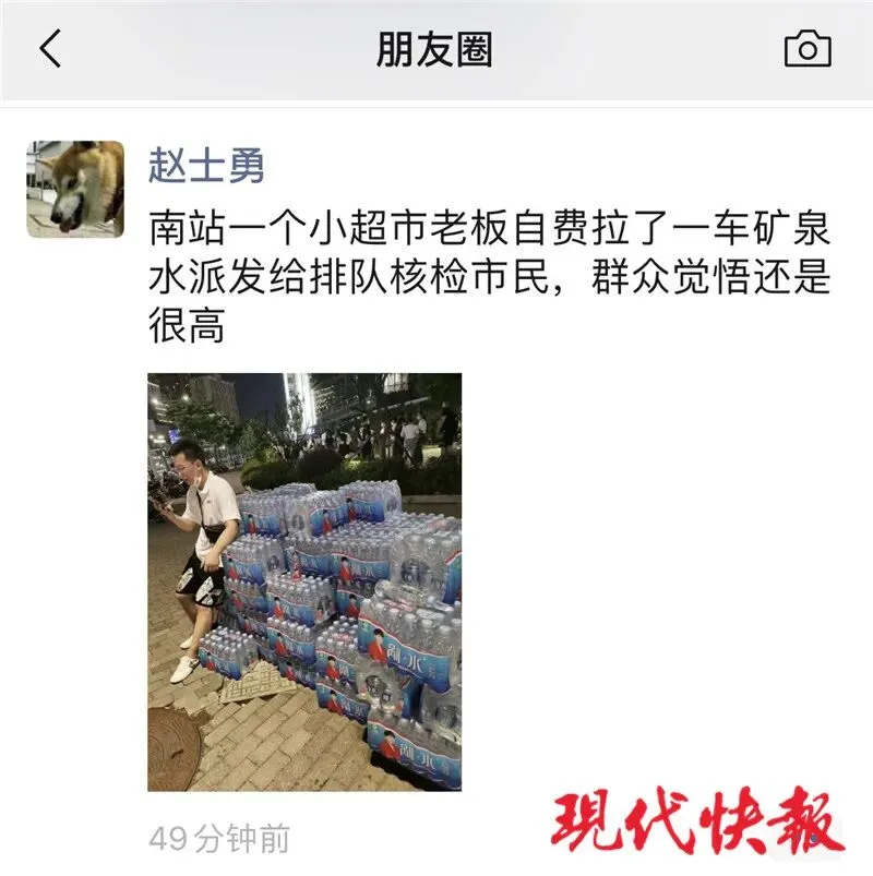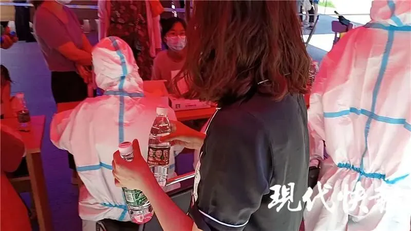 现代快报记者了解到,刁庆龙是附近一家烟酒店的店主。7月21日下午,他做核酸检测,看到排队的人很多。排在他前面的居民有的水喝光了,有的略显疲惫。于是,他拨通自己小店供应商的电话,订购了20000瓶水。