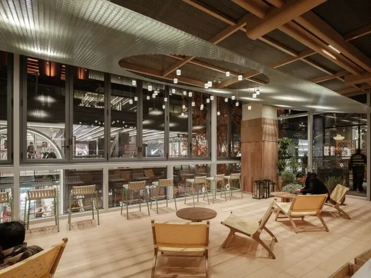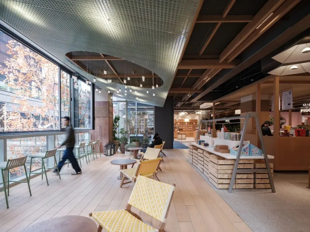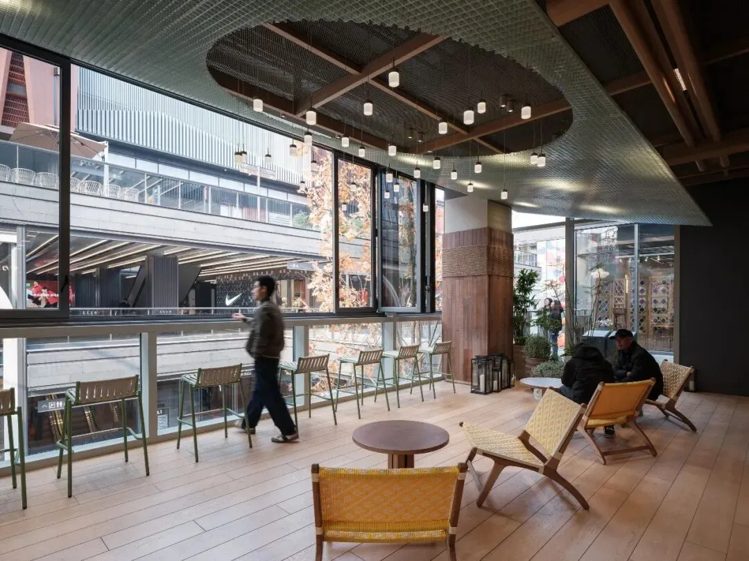 为提升游逛体验,我们有意让渡部分租赁面积,于西侧窗边设置两处休闲 lounge。一方面满足苏州博物馆旗下茶饮品牌的外摆需求,另一方面也为访客营造出绿植环绕、星光点缀的休憩场所。在此凭窗远眺,楼下商街人流如织,恍如“繁华图”中酒楼二层远观街景的当代映照。