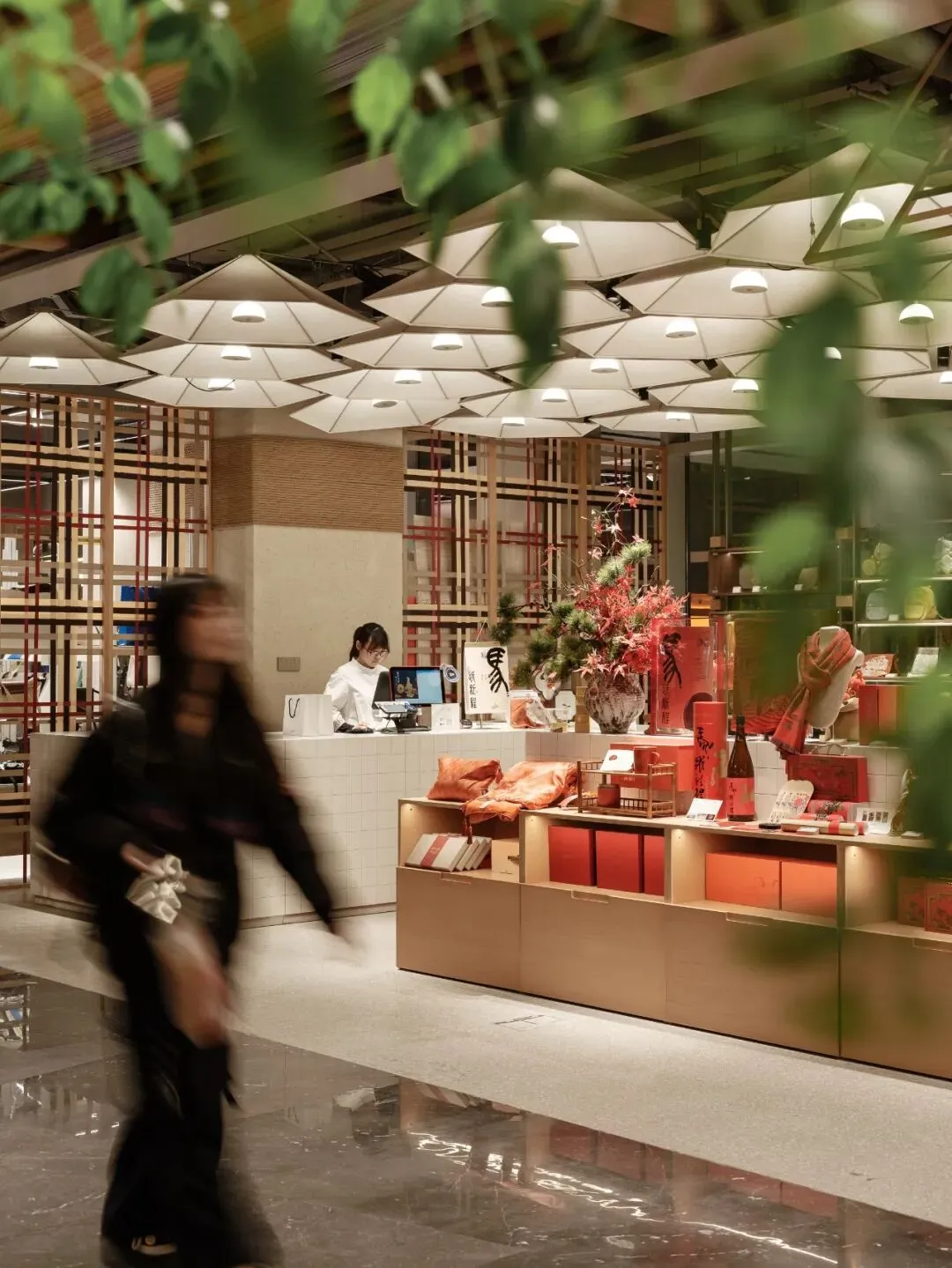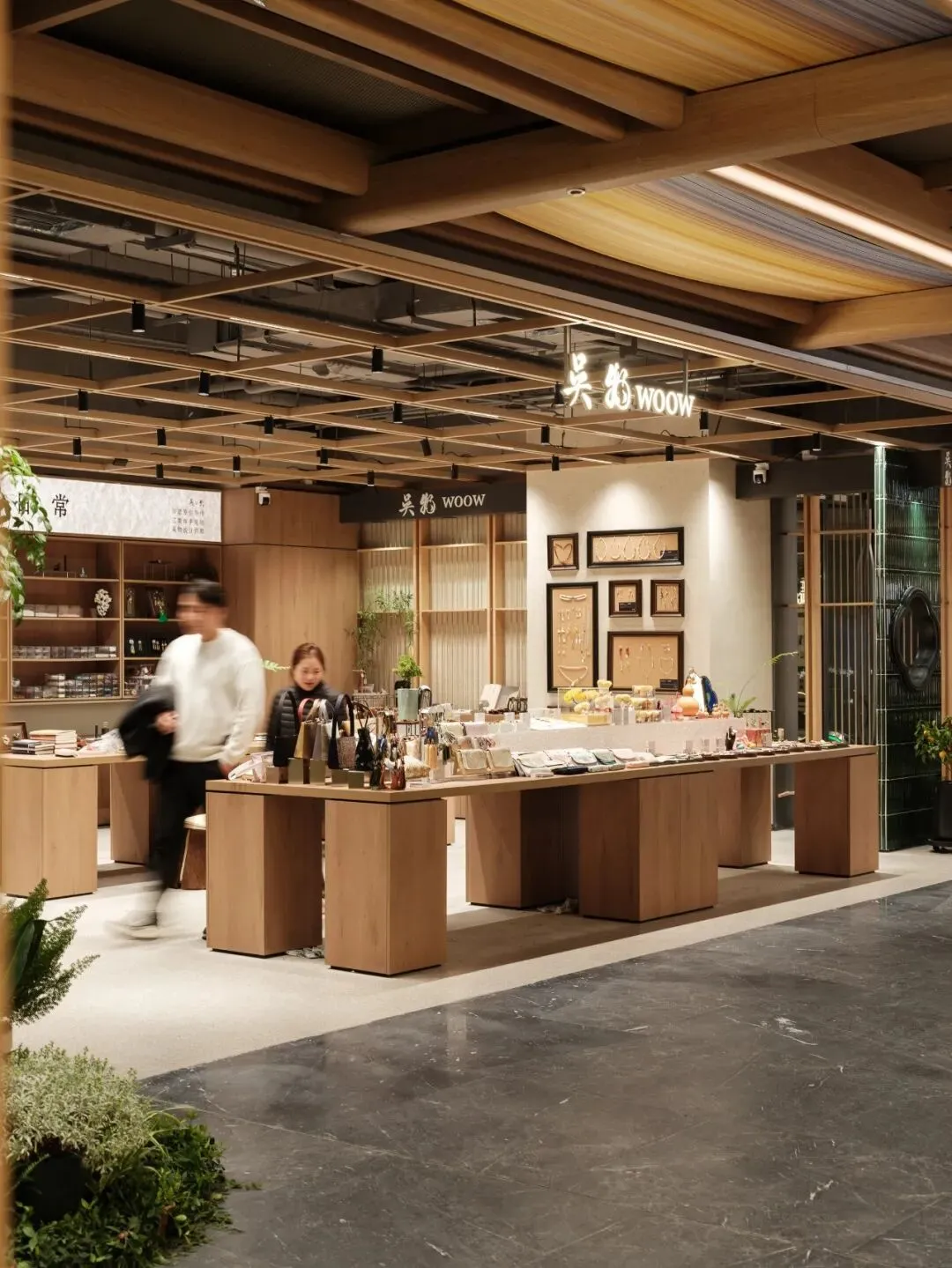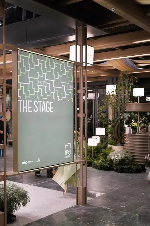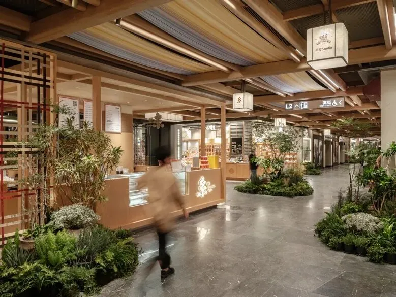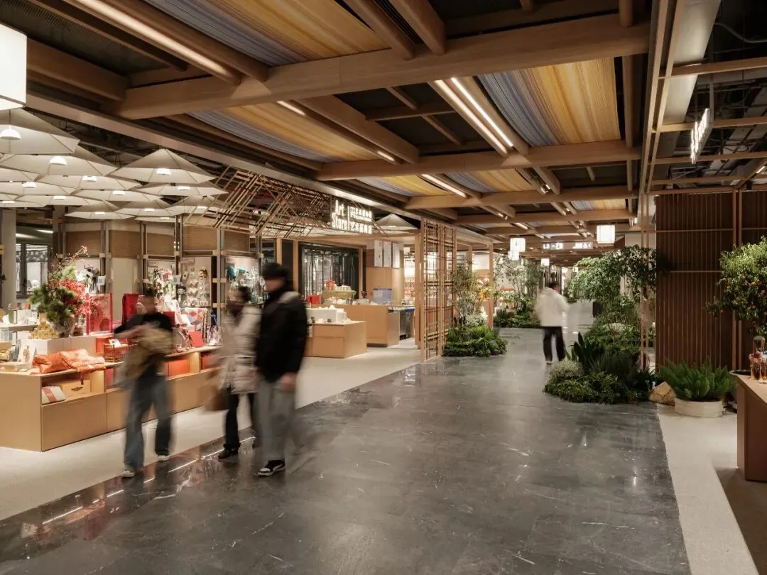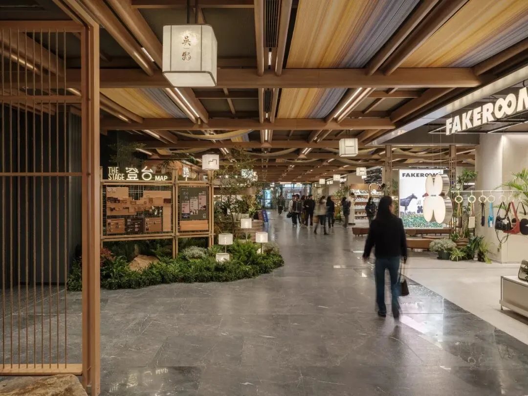 天花设计提取苏式园林的木构屋檐意象,以现代简约手法重新演绎,整合隐藏式灯带与射灯,并巧妙融入消防、出回风等设备需求。地面铺装则借鉴园林石板汀步的布局逻辑,转化为错落斜拼的大理石组合,表面交替使用镜面与荔枝面处理,模拟游人漫步园中的行走体验。各商户门前悬挂灯笼式招牌,高低错落,勾勒出街巷的生动轮廓。公共区域设置多功能灵活空间,未来将承载苏州评弹、烛光音乐会、读书会及品牌影像分享等活动,真正让“登台”处处有戏。