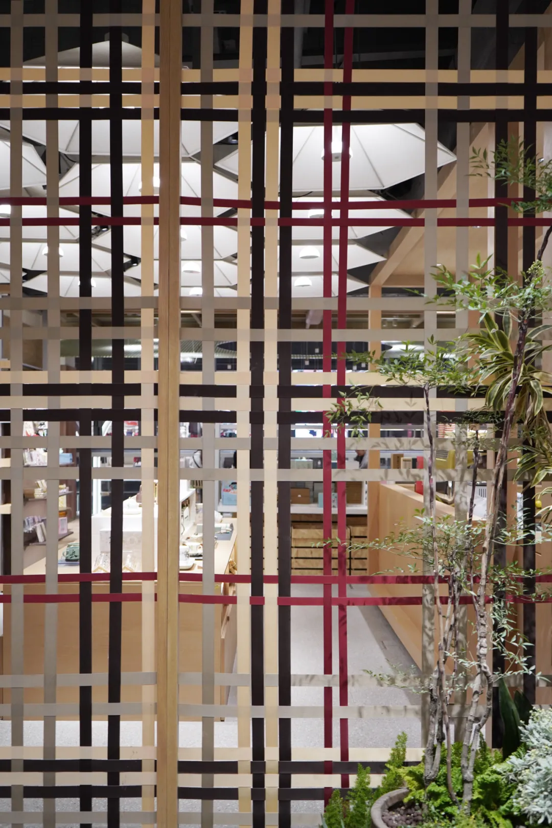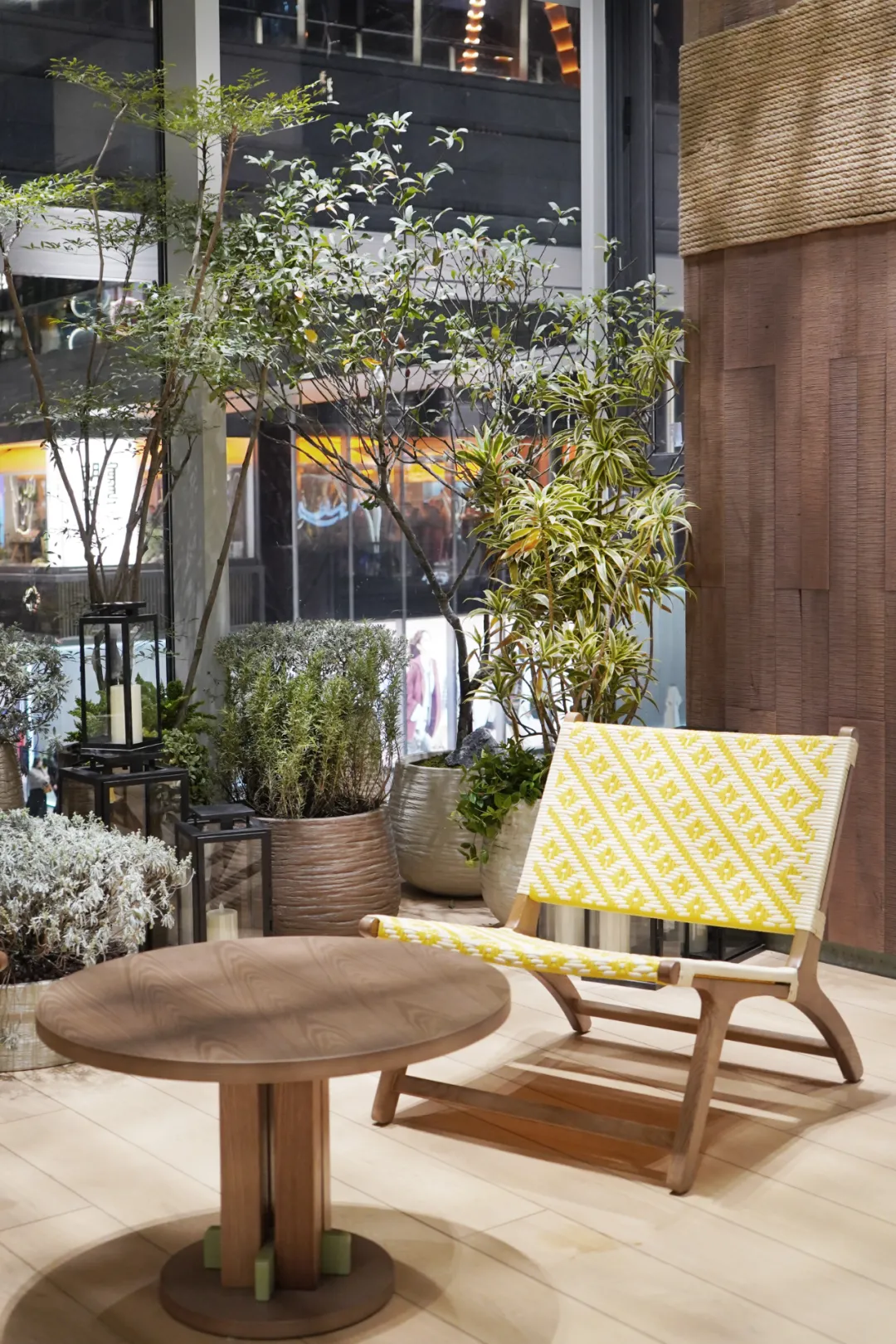 苏州博物馆专区是本次设计的重点之一。我们将非遗竹编工艺转化为现代屏风与装饰吊顶,提取油纸伞的形态并以几何线条简化为天花灯具。老木包裹的结构柱、缠绕装饰的粗粝麻绳,共同构成新旧对话、质朴与精致并存的空间叙事。