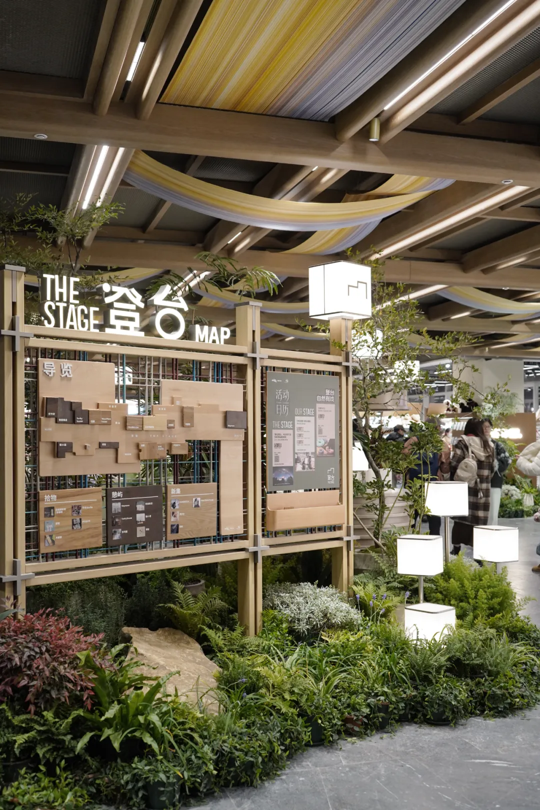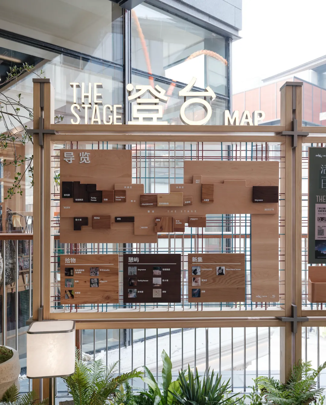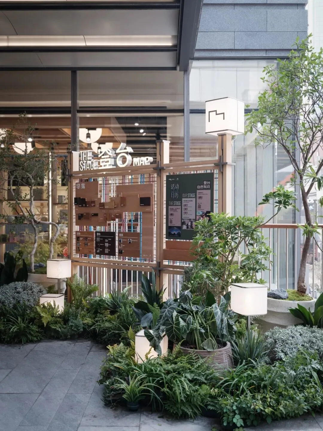 导视系统始终是我们设计的核心考量之一,除满足功能清晰外,亦需准确传达项目气质。木构、绳编、灯笼与绿植等元素构成导览地图的基本语汇,金属绳上悬挂的标识牌皆可拆卸更换,为日后运营预留灵活度。地面绿植景观间点缀灯笼,无论昼夜皆营造出市集般的热闹氛围。