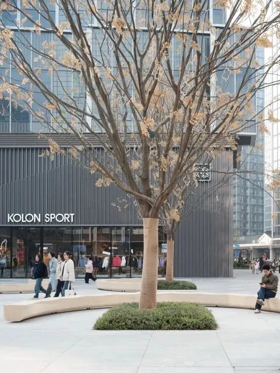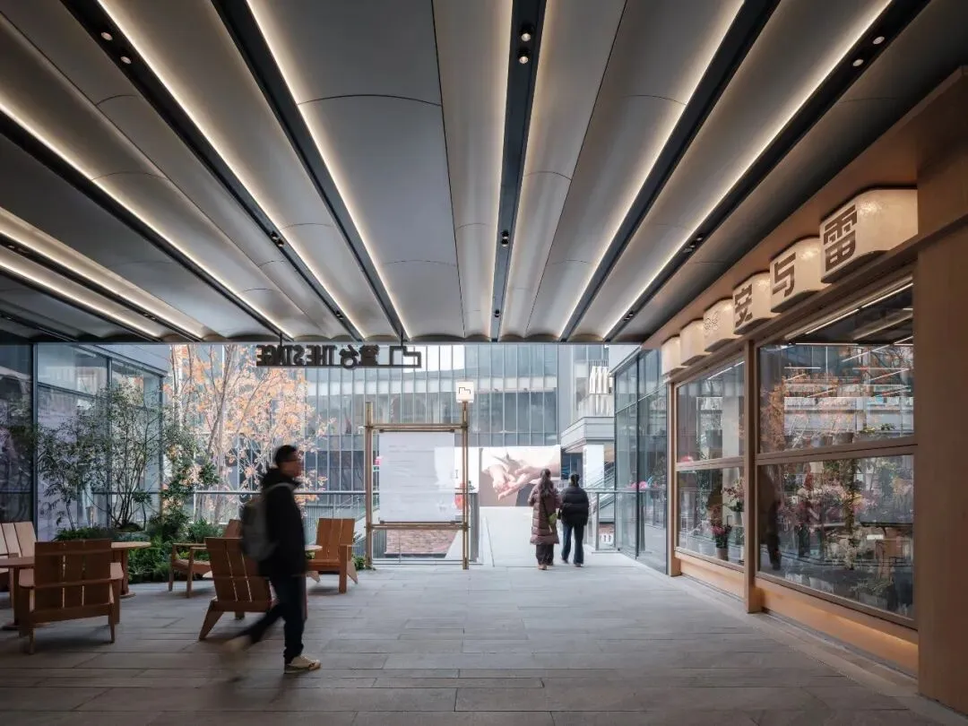 在动线规划上,我们突破传统购物中心布局模式,设置一条贯穿南北连廊的街道式主干道,并增设西侧入口与之交汇。在确保两侧店铺界面充分展露的前提下,通过绿植营造与路径的曲折处理,使主干道形成“曲径通幽、虚实相映”的游逛节奏,激发人们在行进中的探索意趣。