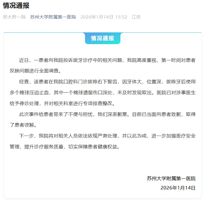 经查,该患者在我院口腔科门诊拔除右下智齿,因牙体大、位置深,拔除牙后使用多个棉球压迫止血,其中一个棉球遗留伤口深处,未及时发现取出。医院已对涉事医生给予停诊处理,并对相关科室进行专项排查整改。