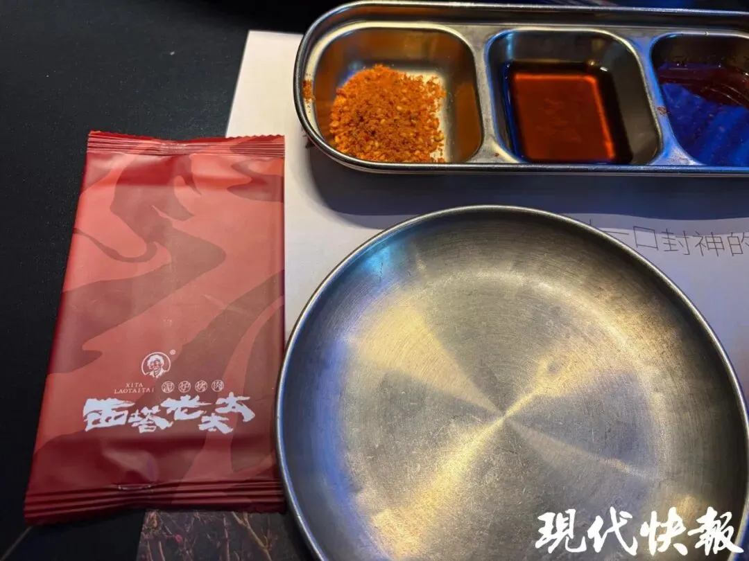 1月11日,现代快报记者以消费者身份前往该店实地探访。餐桌上摆放着金属餐盘,用店里提供的湿巾擦拭后,发现同样擦出了黄色污渍。这是因为餐盘脏还是掉色?店员没有明确回应,只表示“餐具洗过又拿开水冲过”,若介意可更换为一次性餐具。湿巾包装也未标注任何具体成分,店员称是“纯水湿巾,不含酒精”。