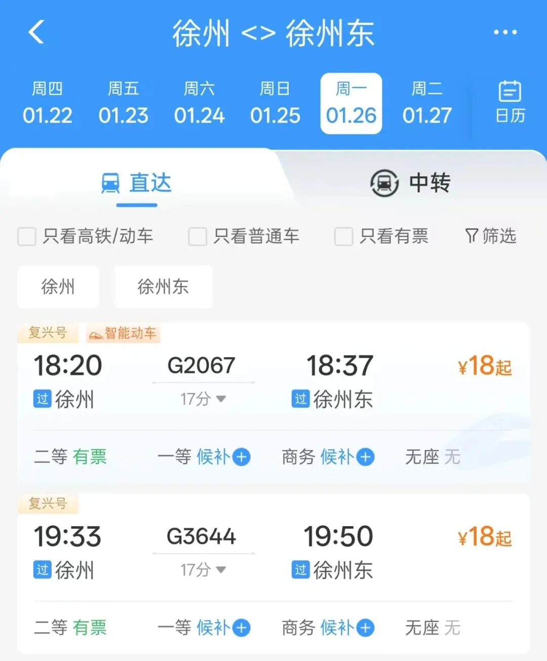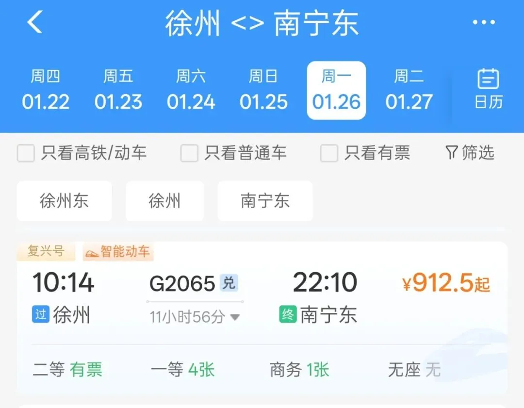此外,记者登录铁路12306系统看到,徐州站至徐州东站间已同步开行高铁,最快17分钟、二等座18元即可抵达,为旅客中转提供“无缝衔接”新选择。