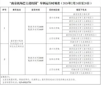 2月24日至28日,南京机场T1、T2航站楼一楼乘车点,每日下午2个班次,免费送返校学生到大学城指定下车点,覆盖所有返乡时的校园站点,不用再为“最后一公里”发愁。