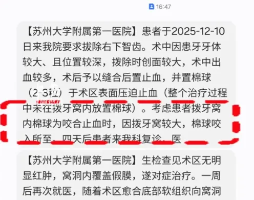 经查,该患者在我院口腔科门诊拔除右下智齿,因牙体大、位置深,拔除牙后使用多个棉球压迫止血,其中一个棉球遗留伤口深处,未及时发现取出。医院已对涉事医生给予停诊处理,并对相关科室进行专项排查整改。