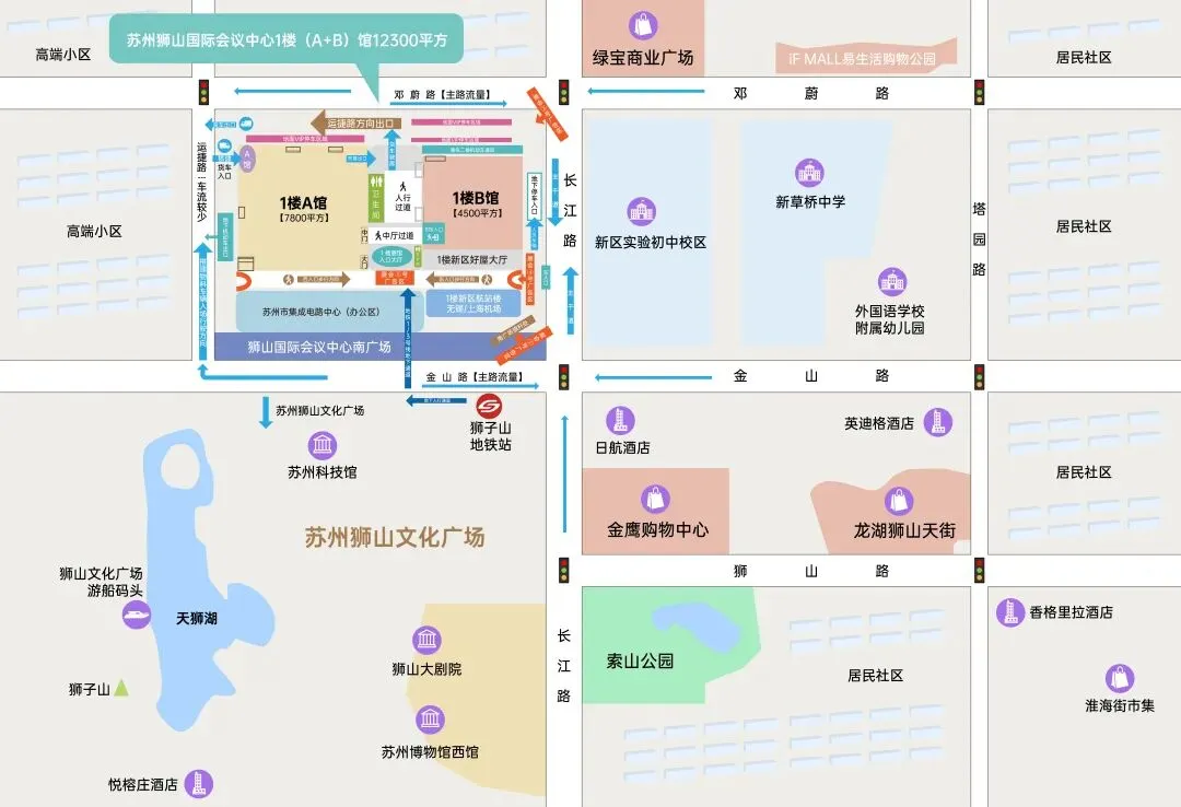 东有金鸡湖,西有狮子山,一座狮子山,半个姑苏城!苏州狮山国际会议中心位于繁华苏州高新区长江路与金山路交汇处,毗邻苏州最热门的龙湖狮山天街,紧邻苏州十大民心工程狮山大剧院,更有绿宝广场、奥莱中心、金鹰国际购物中心、易生活购物广场、新悦汇索山广场、绿宝百货商场等直线距离一公里内商场遍布,商圈环绕,坐拥便利交通和成熟配套,功能完善、人气指数高,集会议、展览、活动、商务、酒店、餐饮等于一体,是举办消费类展会的理想场所。