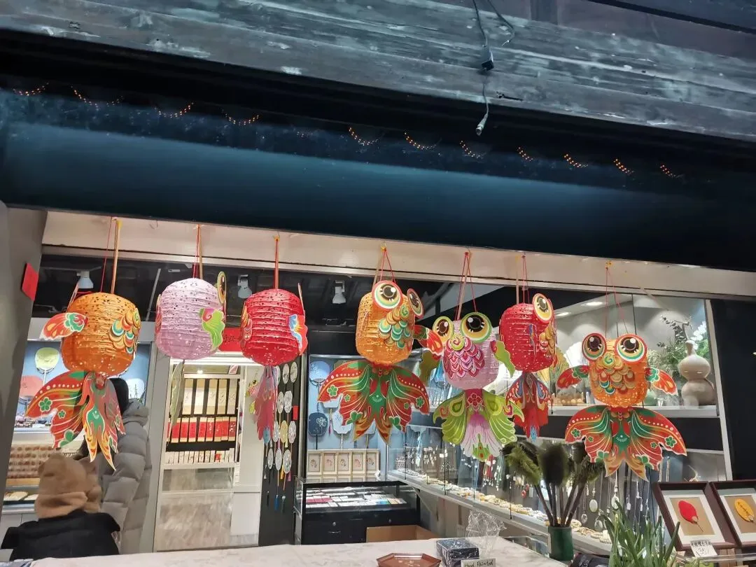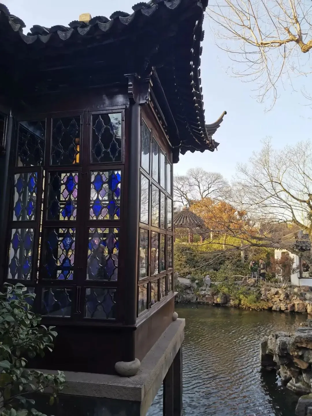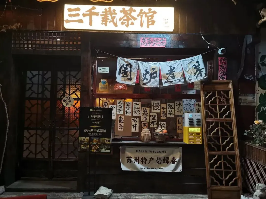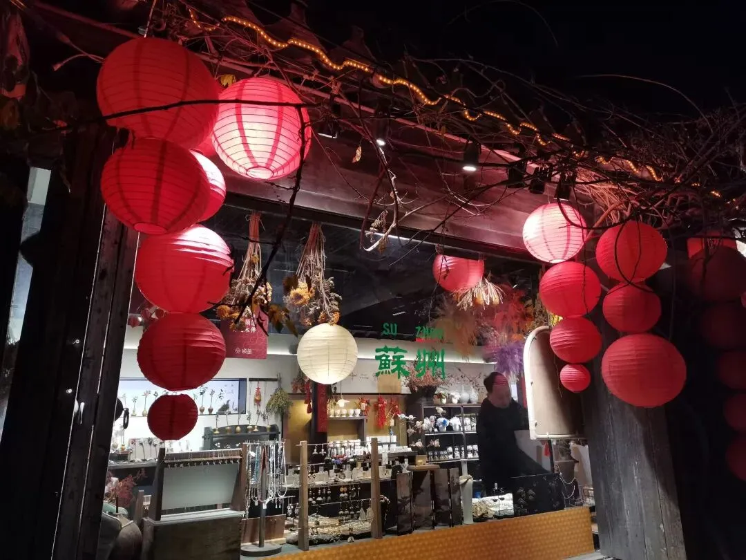 我很喜欢这样的彩色玻璃窗,通过色彩与光影营造出别样的古典韵味。从拙政园出来,去吴记小园楼(西北街店)尝尝苏州菜,毛蟹年糕,荷塘三鲜,盐水河虾,葱油拌面,江浙一带的河虾都很鲜嫩。吃完晚饭,来平江路走一走,晚上的游客不多,逛街的体验感更好。五彩缤纷的灯笼,在夜色下格外喜庆,过年的氛围感立马有了。老字号三万昌的茶饮不错哦,环境也很雅致。