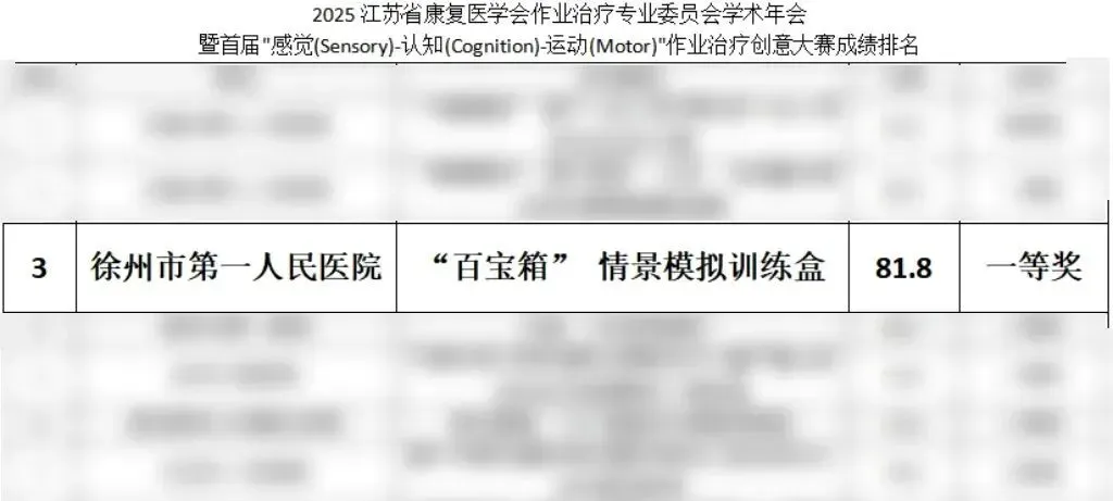本次学术会议同期举办的首届"感觉(Sensory)-认知(Cognition)-运动(Motor)"作业治疗创意大赛吸引了全省众多医疗机构与高校团队参与,竞争激烈。徐州一院康复医学科左菲菲、李薇作业治疗团队报送的《"百宝箱"情景模拟训练盒》凭借其突出的创新性、实用性与科学性,在众多优秀作品中脱颖而出,荣获一等奖。