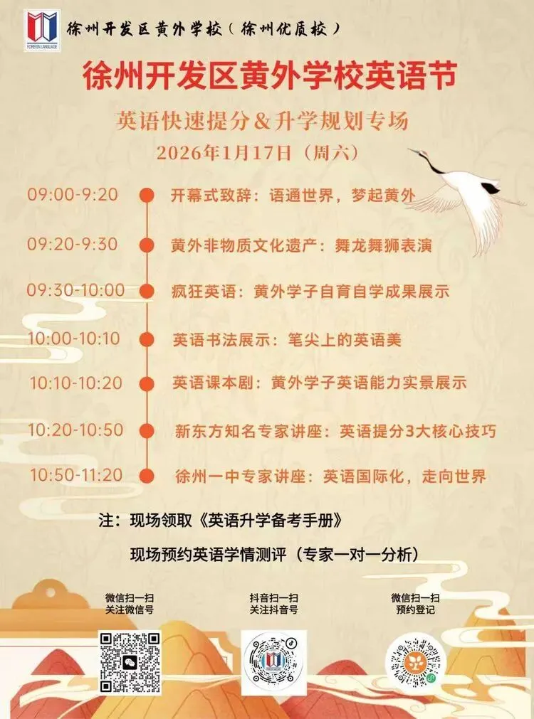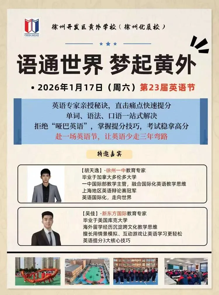 徐州开发区黄外学校(徐州优质校)将于 2026年1月17(周六)上午9:00 隆重举办“英语节”大型主题活动!
