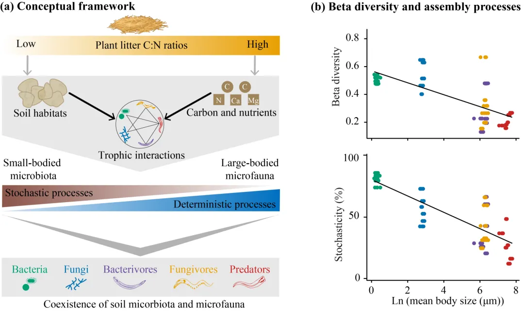 农业集约化是导致土壤生物多样性降低的主要原因,而凋落物添加被认为是保护土壤生物多样性和维持生态功能的重要管理措施。然而,凋落物的化学计量特征(如碳氮比)对不同营养级群落的β多样性及其组装过程的影响仍不明确。本研究通过构建不同植物凋落物形成的碳氮比梯度,测定土壤细菌、真菌及线虫(食细菌线虫、食真菌线虫和捕杂食线虫)的群落多样性及体型谱变化,揭示了凋落物化学计量特征调节土壤生物多样性和群落结构的可能作用机制。