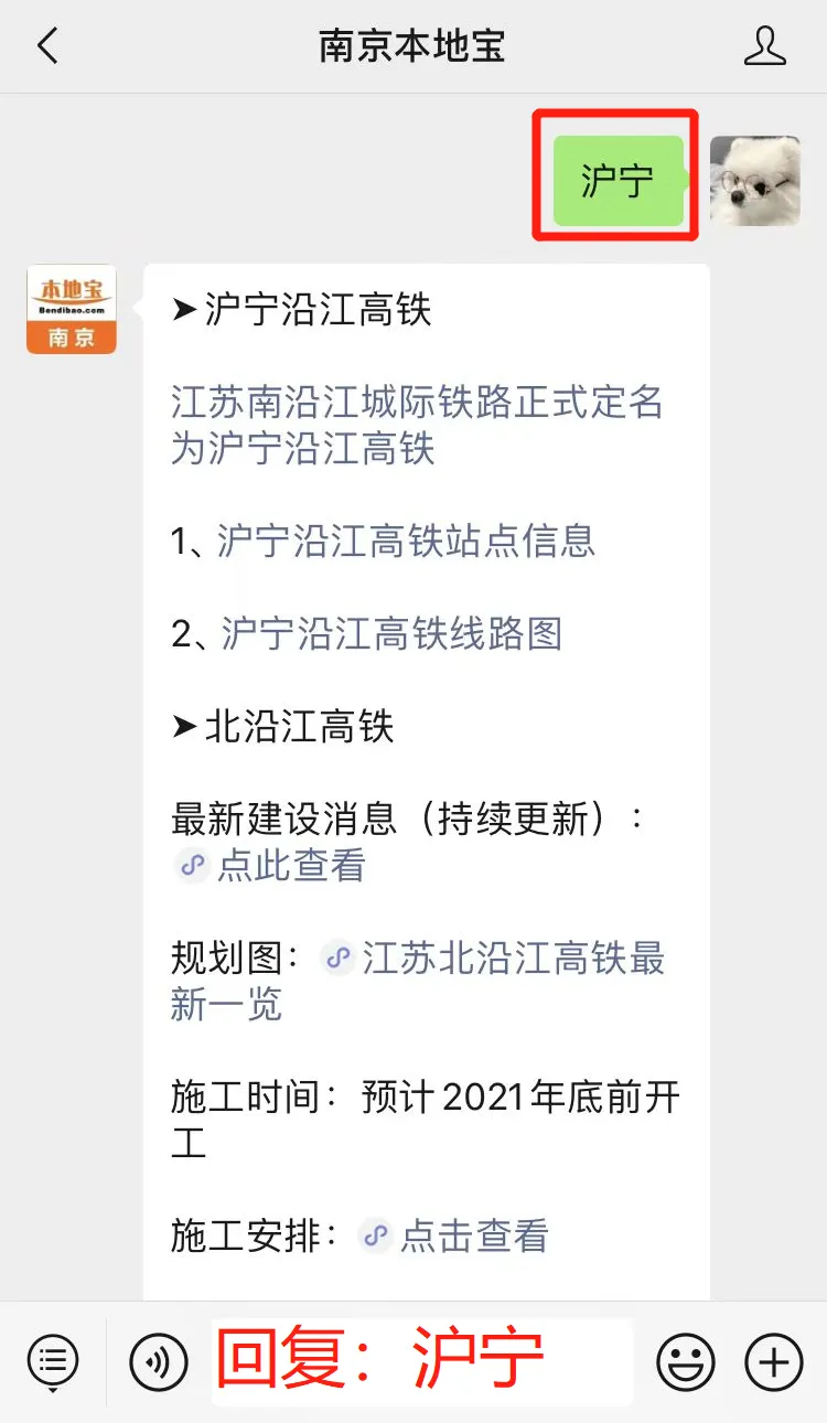 关注【南京本地宝】微信公众号,在聊天对话框内回复【沪宁】即可查看沪宁沿江高铁最新建设动态、规划图、施工安排等。