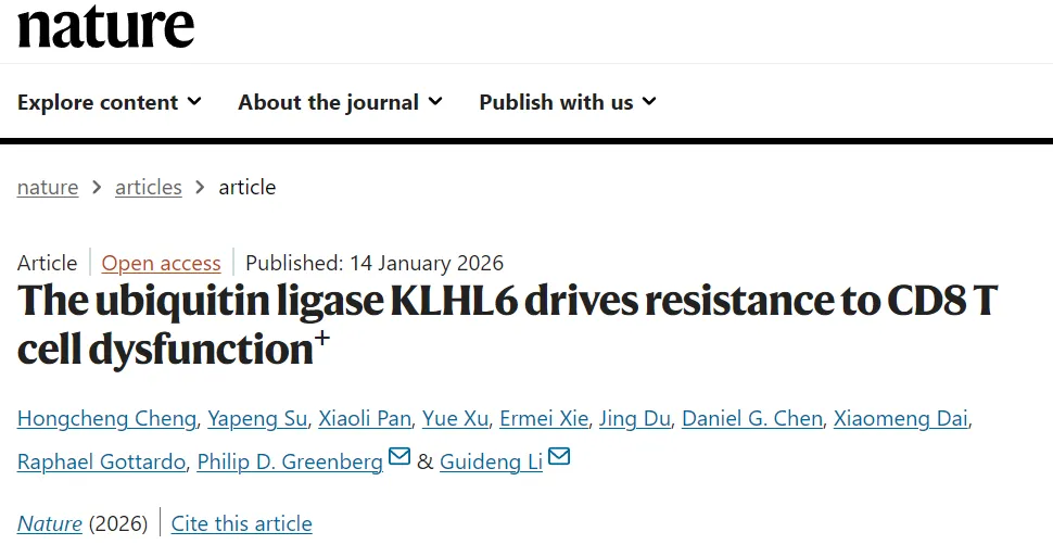 2026年1月14日,中国医学科学院系统医学研究院/苏州系统医学研究所李贵登团队、Fred Hutchinson癌症研究中心的Philip D. Greenberg团队合作在Nature上发表题为:“The Ubiquitin Ligase KLHL6 Drives Resistance to CD8+ T Cell Dysfunction” 的研究论文。该研究发现E3泛素连接酶KLHL6是T细胞耗竭和线粒体功能障碍的双重负向调控因子。