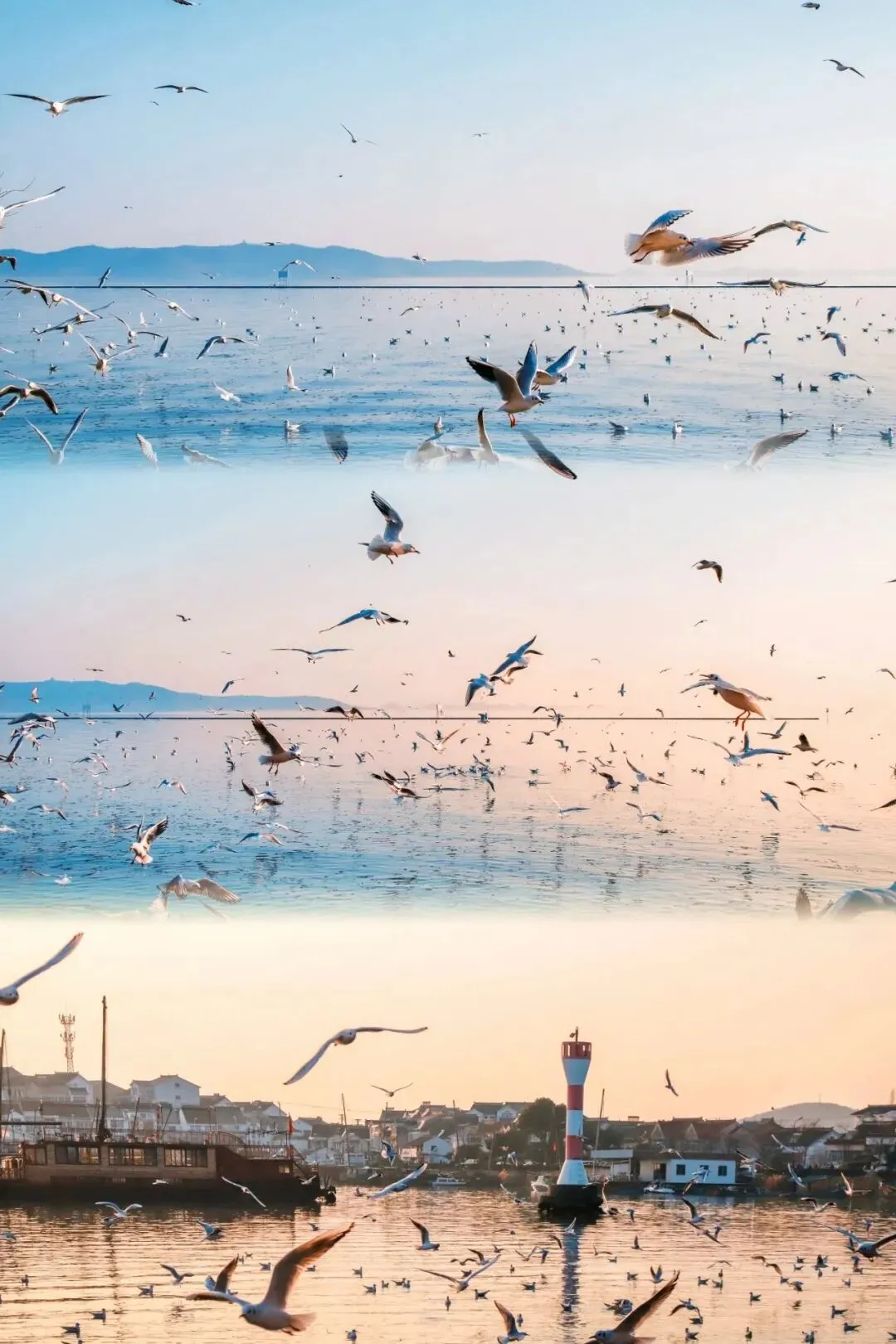 太湖一带,尤其是光福,码头、浅滩、甚至渔船边,无论日出、日落,都会聚集着成片的红嘴鸥,现在,就是去看它们最好的时候。