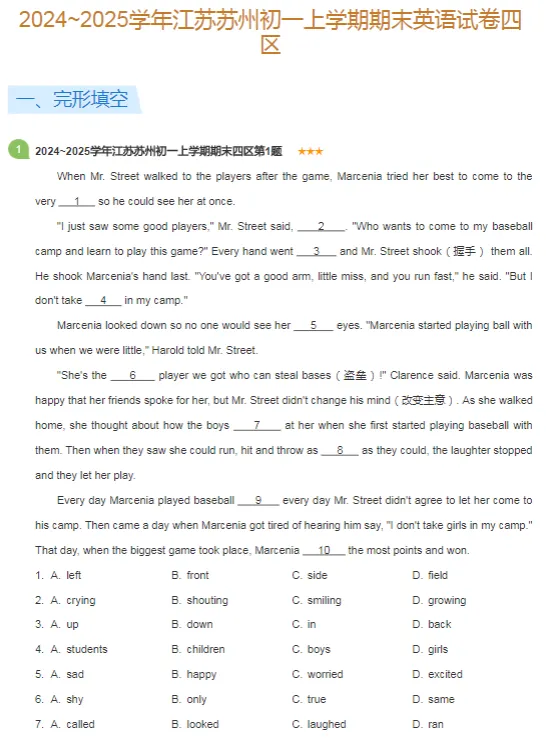 2019-2025年苏州各区初一上学期期末英语真题及答案解析