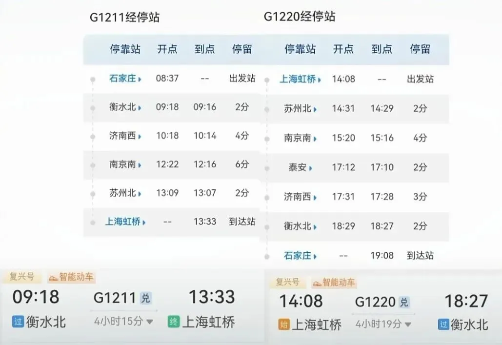 G1211次9时18分自衡水北站出发,13时33分抵达上海虹桥站,用时4小时15分钟,返程G1220次14时8分从上海虹桥站开出,18时27分返回衡水北站,用时4小时19分 。旅客可通过铁路12306官方网站及手机App购买车票