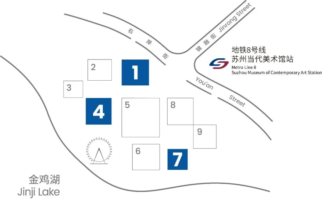 苏州园区站:轨交8号线至“苏州当代美术馆站”(1号出口)。