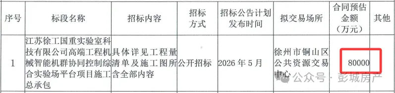 刚曝出!徐州又有大动作!这一次徐工要猛砸8个多亿,进驻徐州城北的柳泉镇,建设一个世界级的工厂!据说,这里将致力于成为国内机械工程行业规模最大、功能最全的国际性整机试验基地。就在1月12日,徐州公共资源交易平台发布消息,《高端工程机械智能机群协同控制综合实验场平台项目》招标计划对外发布,其中提到,该项目位于江苏省徐州市铜山区柳泉镇镇区北区,北墩村以东,津浦铁路以西!说到这可能会有人担心,如此大规模的工厂建设,会不会对环境造成一定的污染?其实你想多了,我们看一下项目的建设内容就知道了!具体如下:项目主要建设:智能化、数字化的实验场地(动态广场、可靠性环路、越野环路、矿卡路、动态广场入场路、长平直线路等)、实验测控中心、办公楼实验准备间等设施,配套建设给排水、供配电等基础设施。值得注意的是,这个项目的施工总承包,合同预估金额就要在8个亿左右,预计招标时间是在2026年5月。综上,我们可以看到徐工在徐州城北的柳泉镇,可谓是斥巨资打造一个高精尖平台,此举不仅能有效拉动徐州经济的增长,同时,相信对于当地人来说,应该也能增加不少就业岗位,可谓是利国利民!据悉,这一次徐工在柳泉镇的动作真不小,根据《铜山发布》2026年1月12日消息,整个“徐州徐工工程机械智能机群协同控制综合实验平台”项目总占地是4327亩,其中新征用地1597亩,租赁土地2730亩。更振奋人心的是,该项目还获得了江苏省的力挺,就在1月9日江苏省发改委官网发布的——2026年江苏省重大项目清单,该项目也是赫然在列!我看了一下本次铜山入选2026江苏省重大项目清单的一共有7个,这个项目的占地面积是最大的!如此大的规模,这也意味着,徐州城北的柳泉镇,将会因为该项目的进驻,改头换面,迎来重大发展机遇!严禁洗稿,盗用图片,请自重!彭城房产未授权任何自媒体复制/抓取本账号内容,禁止盗用素材/图片,违者必究!