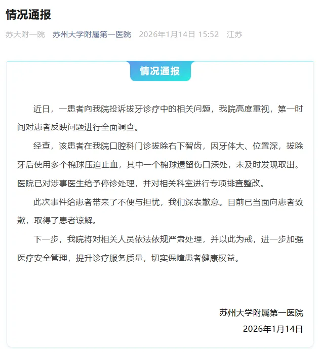经查,该患者在我院口腔科门诊拔除右下智齿,因牙体大、位置深,拔除牙后使用多个棉球压迫止血,其中一个棉球遗留伤口深处,未及时发现取出。医院已对涉事医生给予停诊处理,并对相关科室进行专项排查整改。