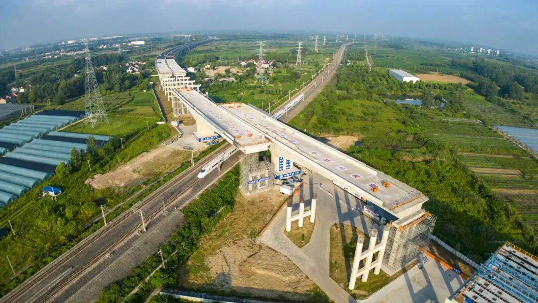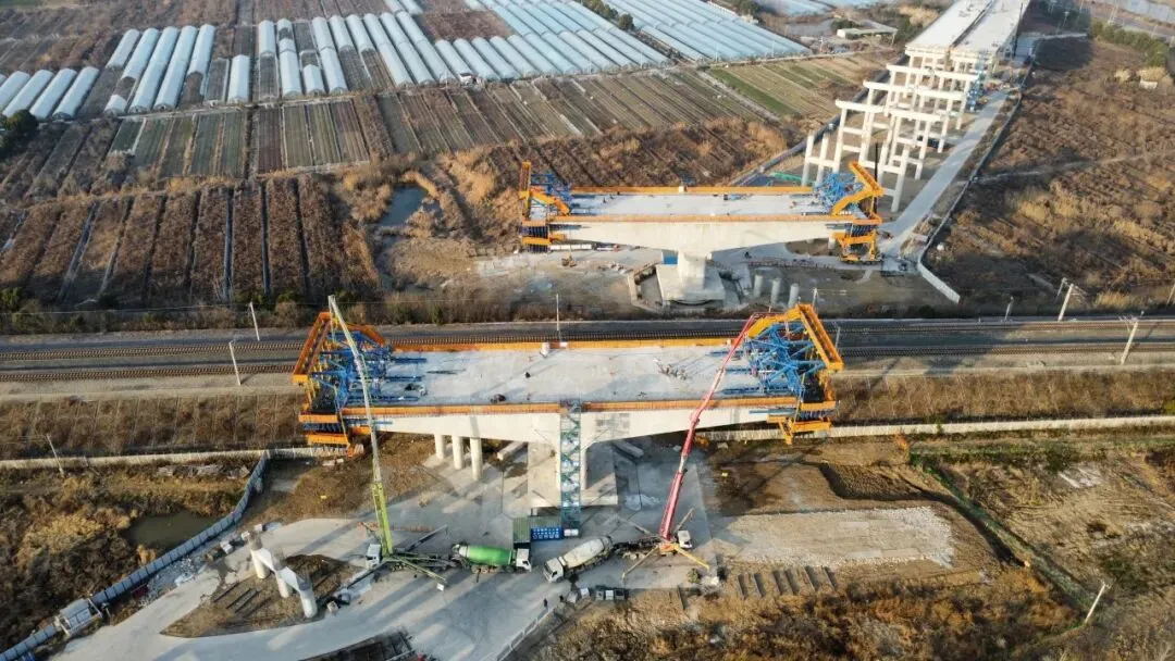 枣林湾特大桥跨宁启铁路的主桥转体施工是全线重难点工程。项目团队积极开展技术攻关,运用BIM技术进行转体过程模拟与碰撞分析,确保了转体系统安装定位精准无误。依托智能转体监测系统对转体过程进行实时动态调控,最终实现了转体桥与铁路两侧桥墩的毫米级精准对接,并成功开创了国内双工作面盆式转体支座应用的先例,为同类跨铁路桥梁施工积累了宝贵的实践经验。