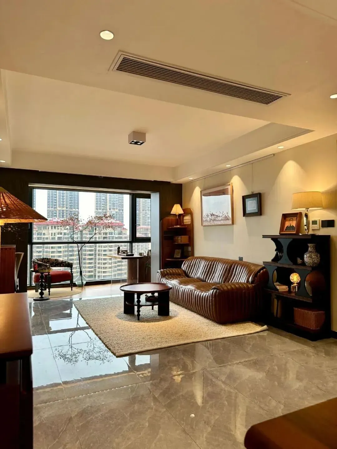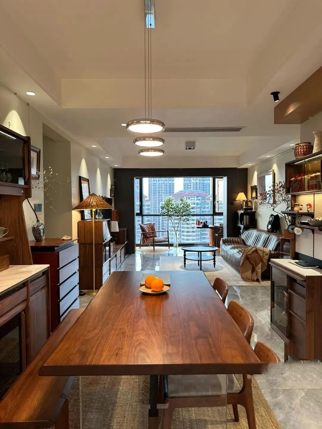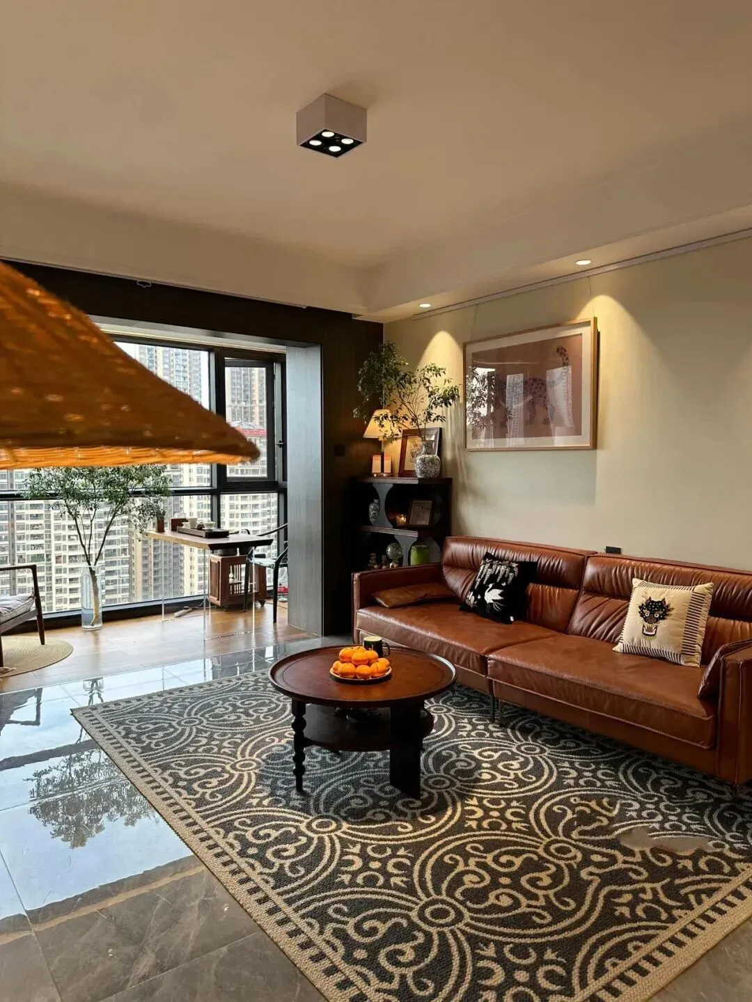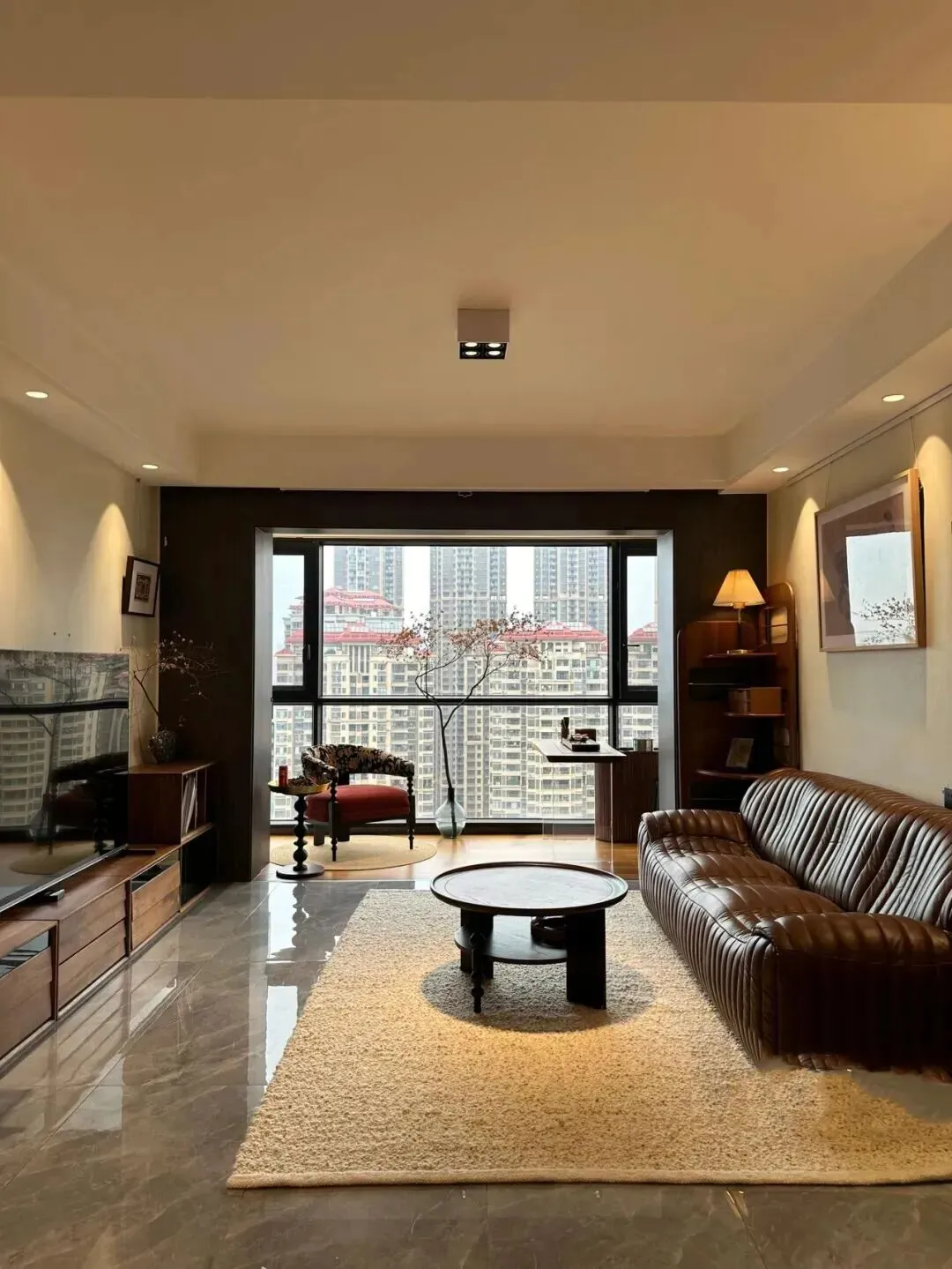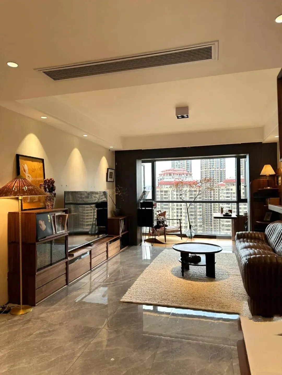 走进客厅,整体色调稳稳当当,主色是温暖的棕色和深胡桃木,沙发选的是一字型深棕皮质款,坐感软硬适中,皮面有点复古光泽,越看越耐看。