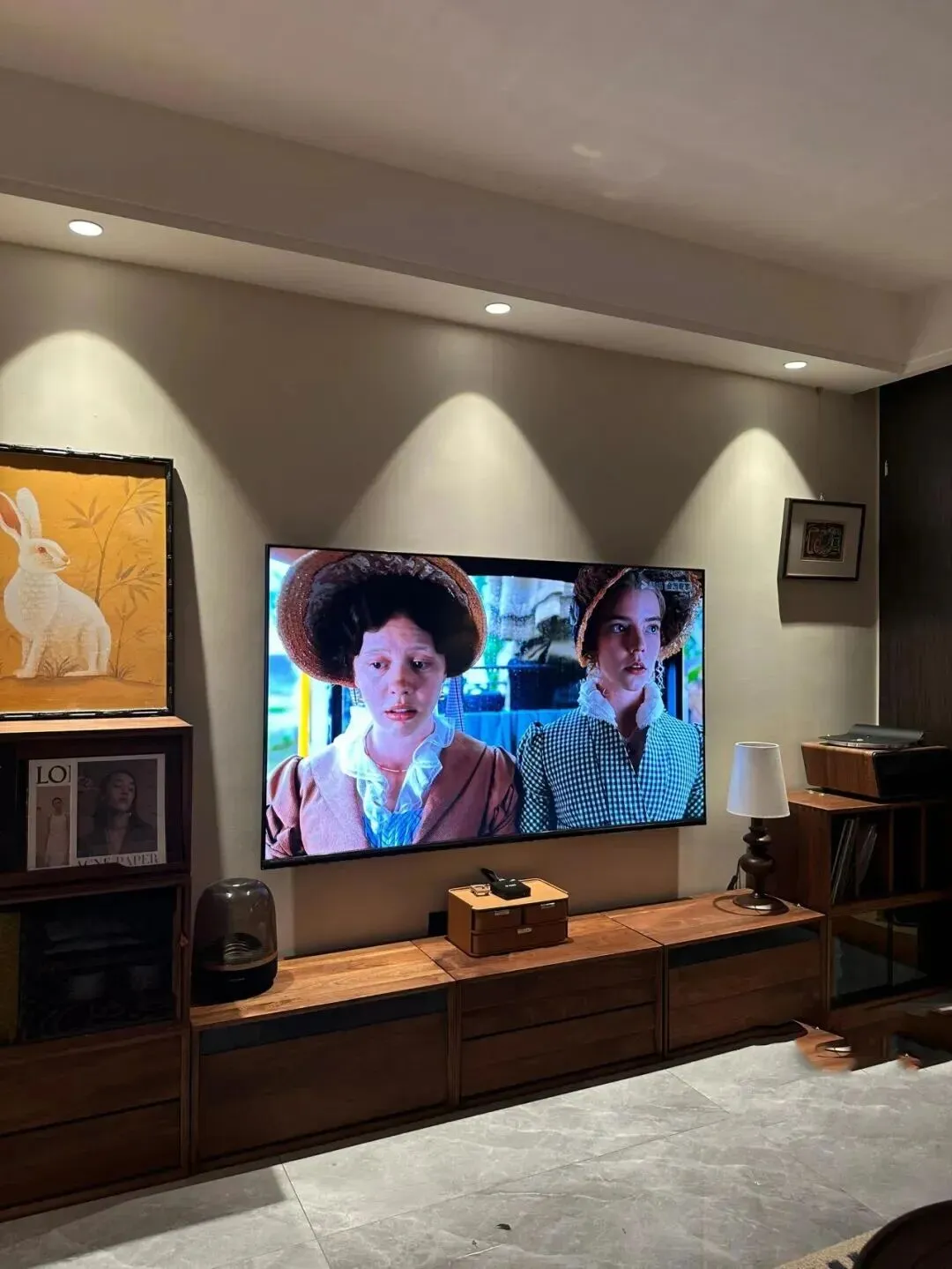 电视墙没有做复杂造型,直接用浅色乳胶漆,搭配一排原木电视柜,简简单单反而更耐看。