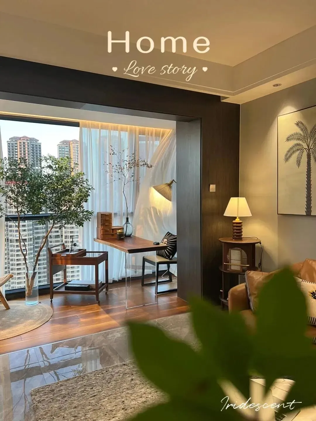 值得一提的是,客厅和阳台之间没有明显的隔断,阳台被改成了工作区和小型景观区。