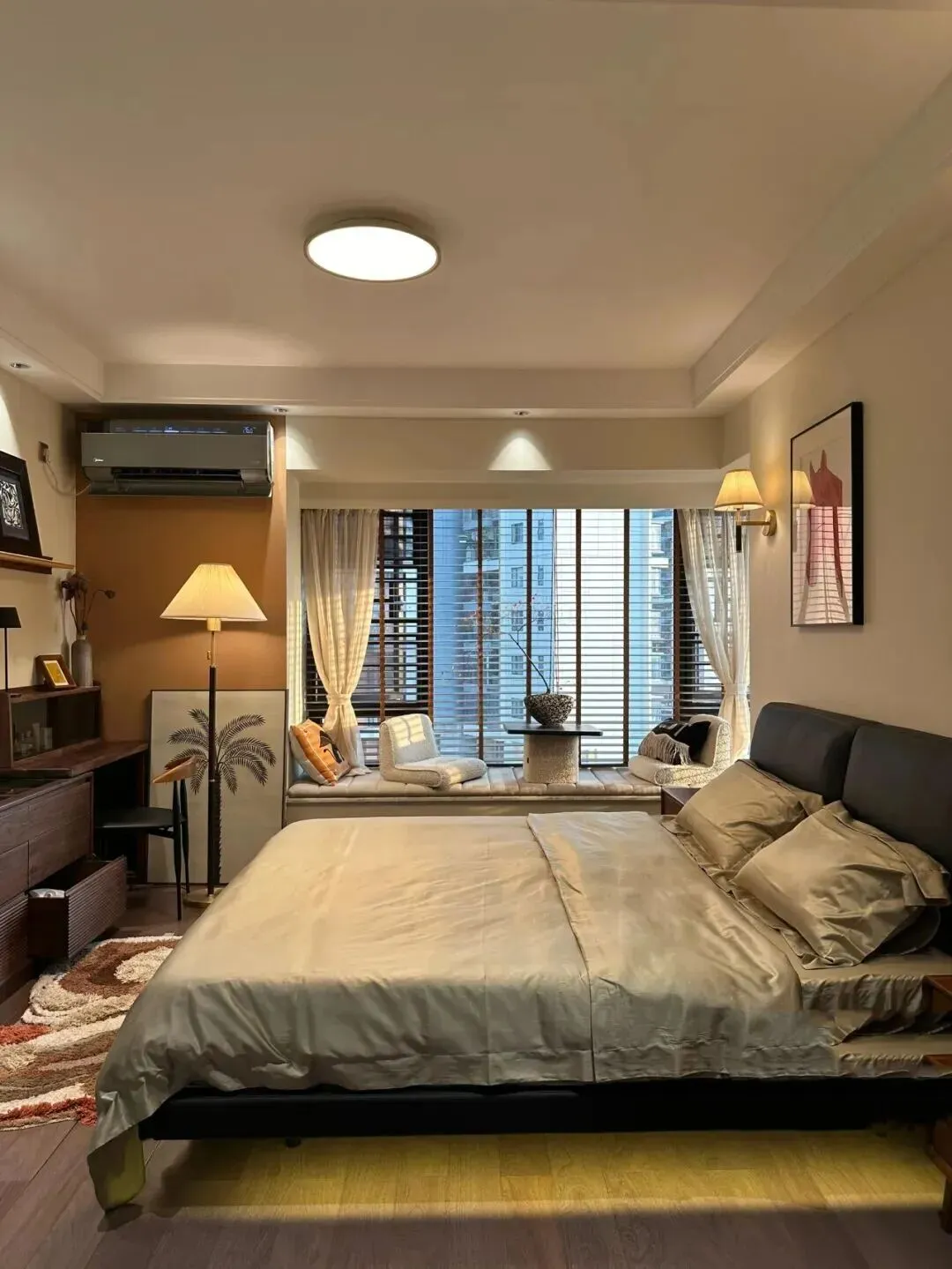 床头灯和壁画相互呼应,夜里开灯有种温暖的包裹感。