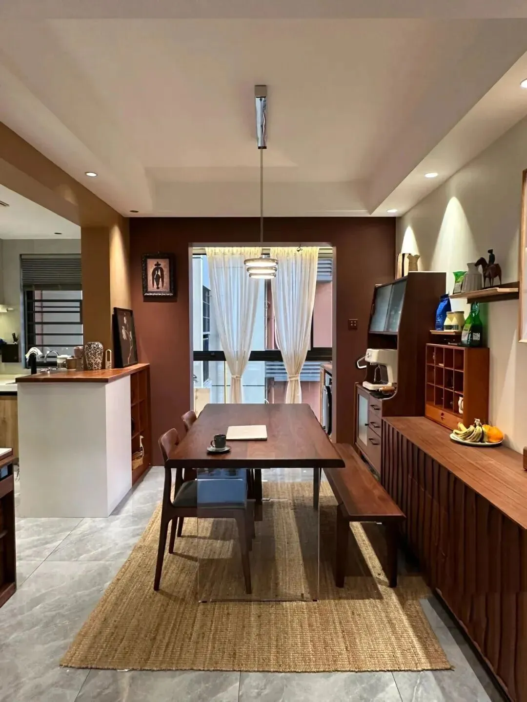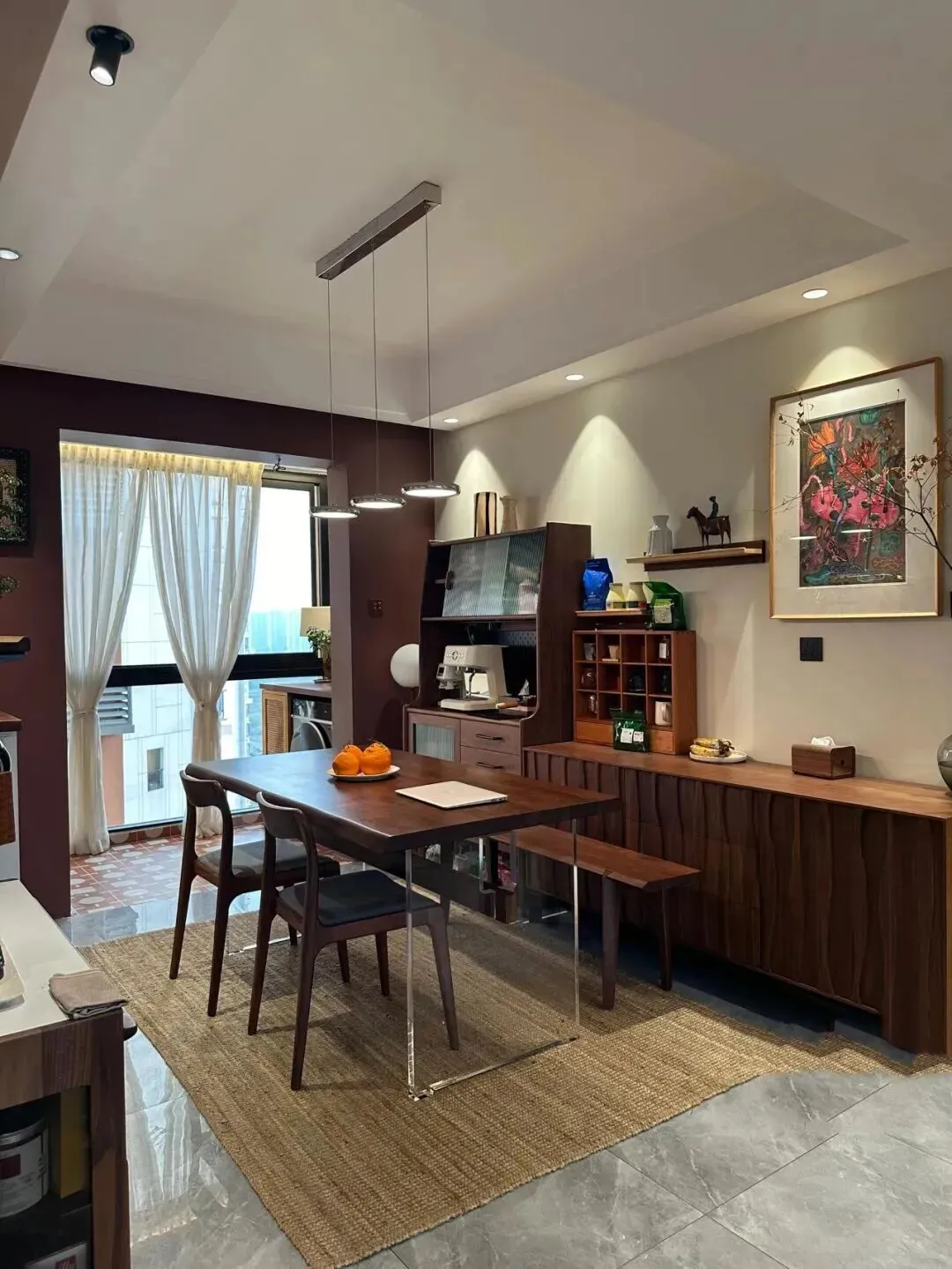 回到餐厅区,靠墙的餐边柜上摆放着咖啡机和各种小器皿,收纳空间充足,每样东西都有自己的位置。
