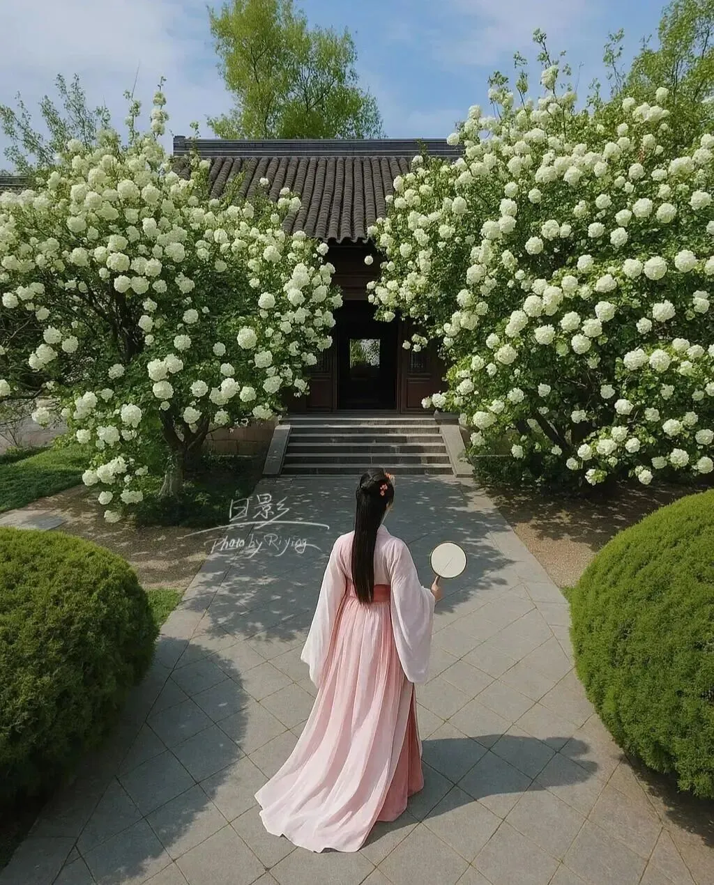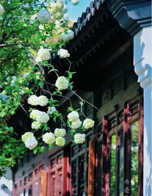 白墙黛瓦 , 木窗棂 , 石灯笼 , 再配上这雪白的花瀑......