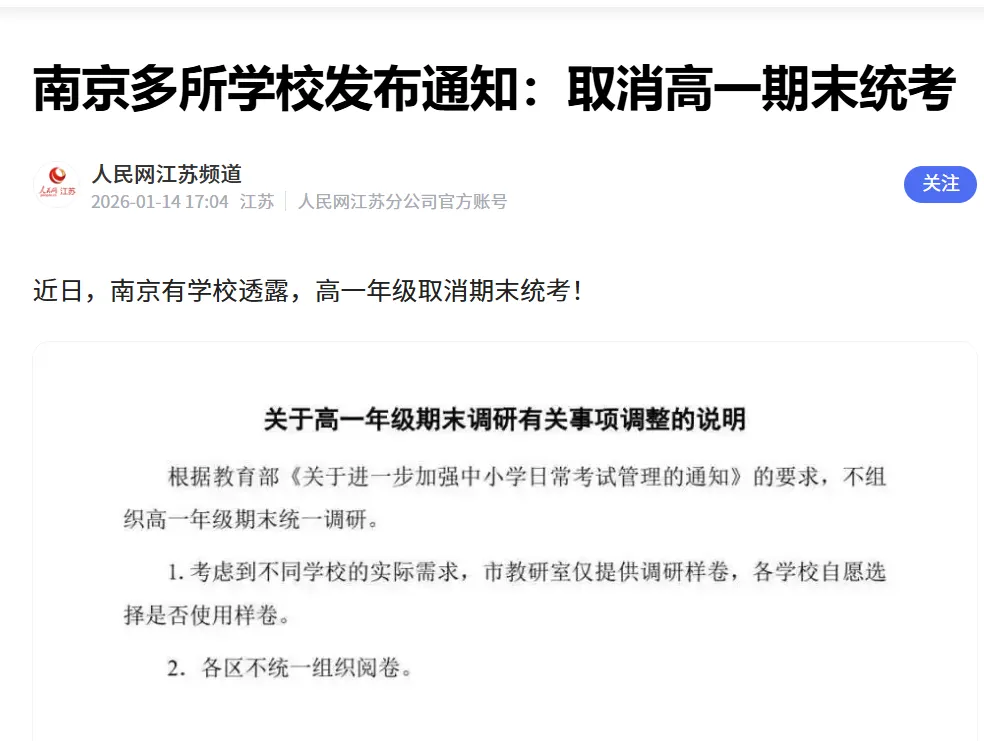 这一调整并非孤立事件,而是全国性教育改革的缩影。成都、青岛等地近年也陆续叫停高中非毕业年级统考,这是非常明显的风向转变,释放出教育评价体系转向的强烈信号,教育管理者应该从中看出苗头来。