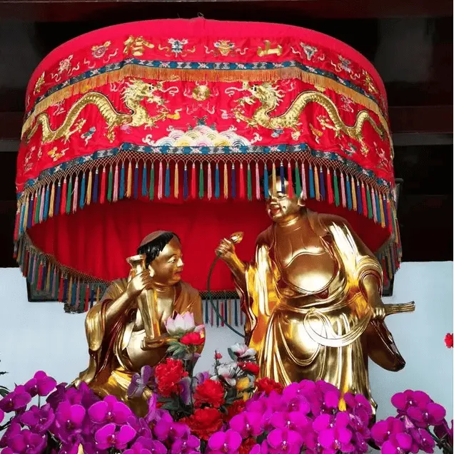 寒山拾得的故事并没有就此结束。在中国丰富多彩的民间信仰中,“和合二仙”是一对极具亲和力的神仙。他们不仅是婚姻美满的象征,更承载着人们对家庭和睦、人际和谐以及生活富足的美好祈愿。其实现在大家熟知的和合二仙亦是指寒山拾得这二位。那么这二位诗僧又是如何升格成为和合二仙的呢,且听下面细细说来。