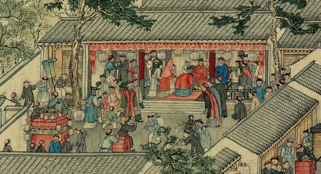 而在苏州,婚俗中还有一项重要的内容称作拜二仙。已故著名历史学家民俗学家顾颉刚教授在《吴歌甲集》中收录的与吴地婚俗有关的吴歌《太太长》中有“一拜天,二拜地,三拜家堂和合神,四拜夫妻同到老。红绿牵巾进房门,坐床撒帐挑方巾。”的记录,这与我们熟知“一拜天地”、“二拜高堂”和“夫妻对拜”相比,不仅分别向天地施行拜礼,还要拜和合二仙,真是独具特色。