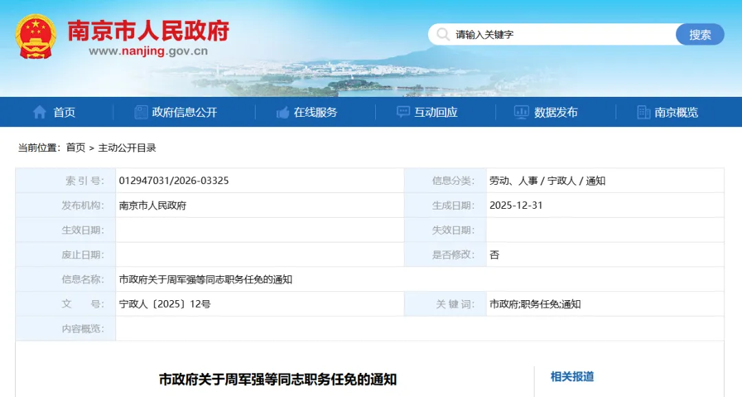 周军强同志任南京江北新区管委会副主任;